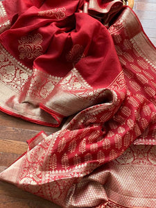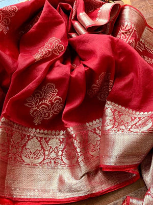 Elegant red linen Banarasi silk saree for festive occasions! The saree comes with a matching blouse piece. Shop online from Pure Elegance.