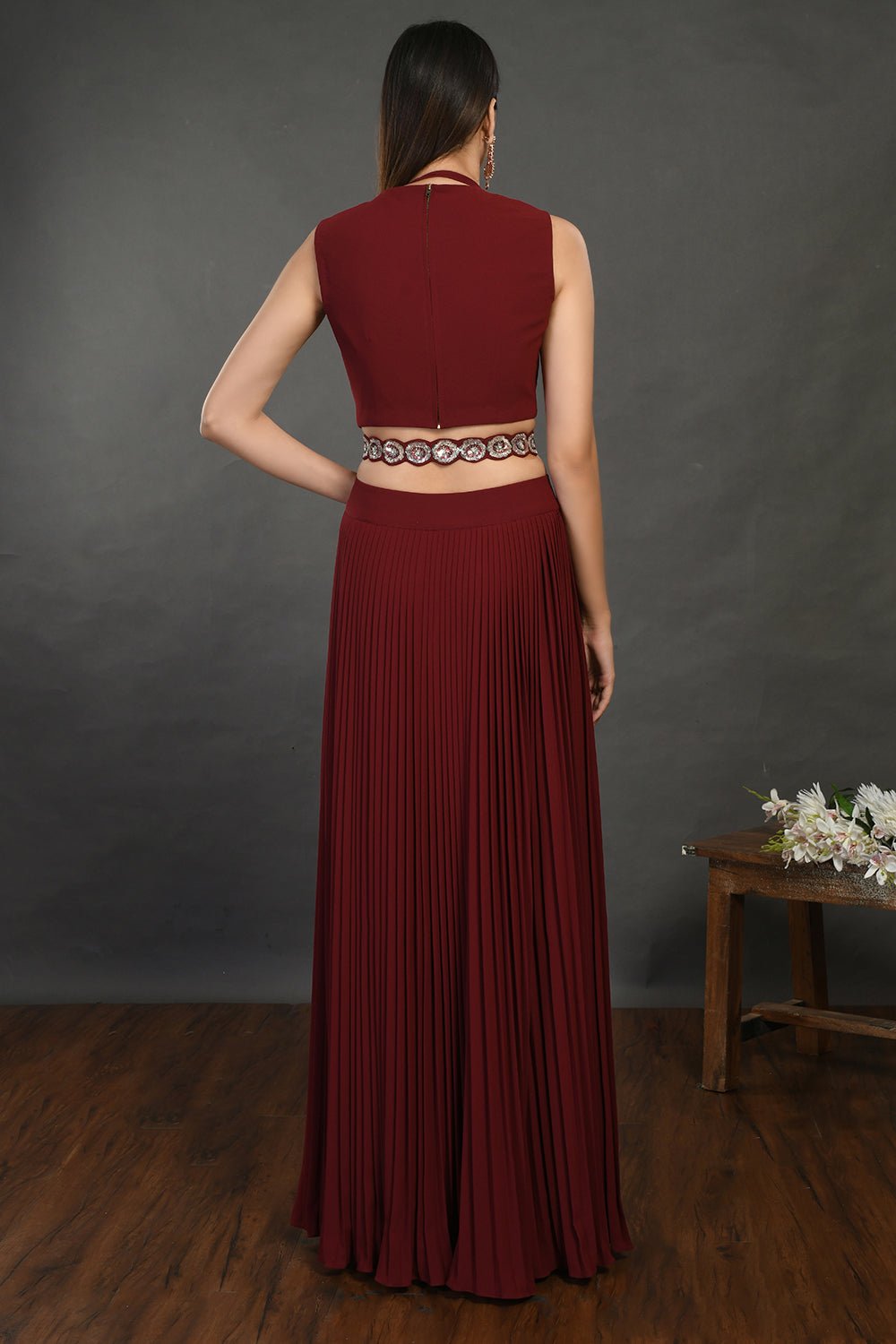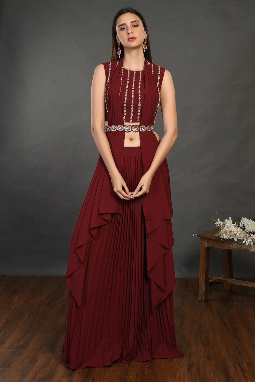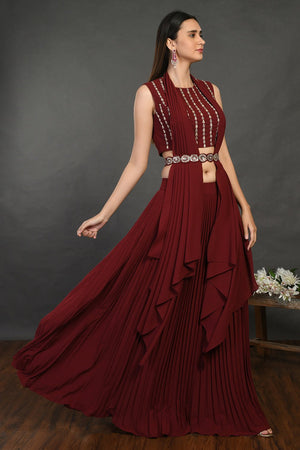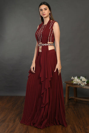 Beautiful wine embellished crop top with skirt and belt is perfect for cocktail parties and contemporary wedding look. Shop online from Pure Elegance.