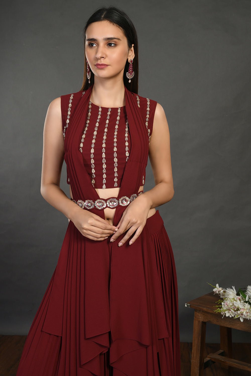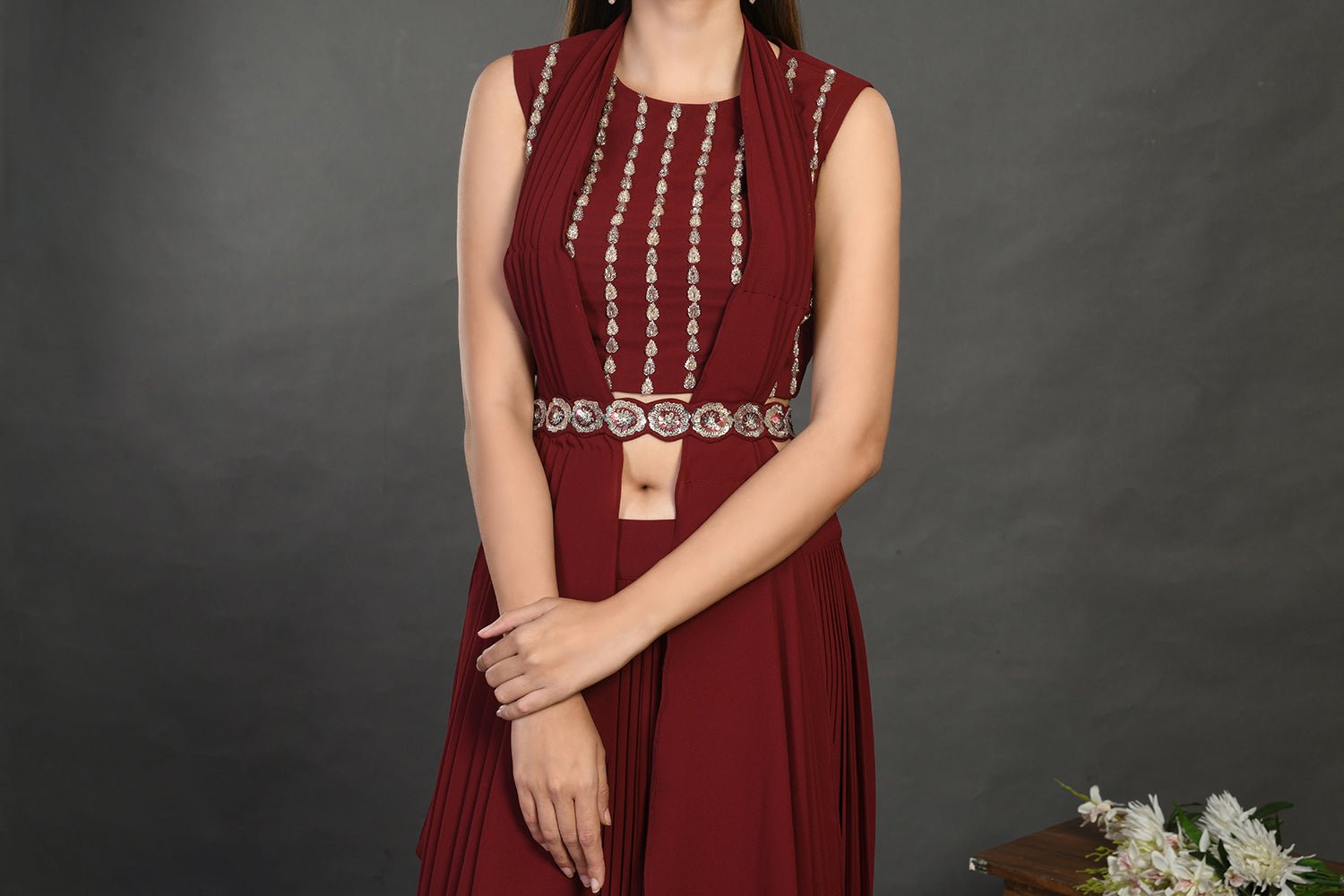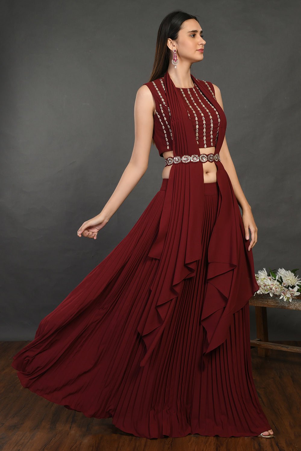 Beautiful wine embellished crop top with skirt and belt is perfect for cocktail parties and contemporary wedding look. Shop online from Pure Elegance.