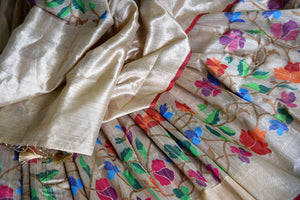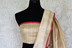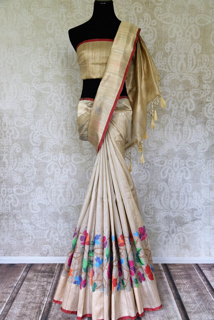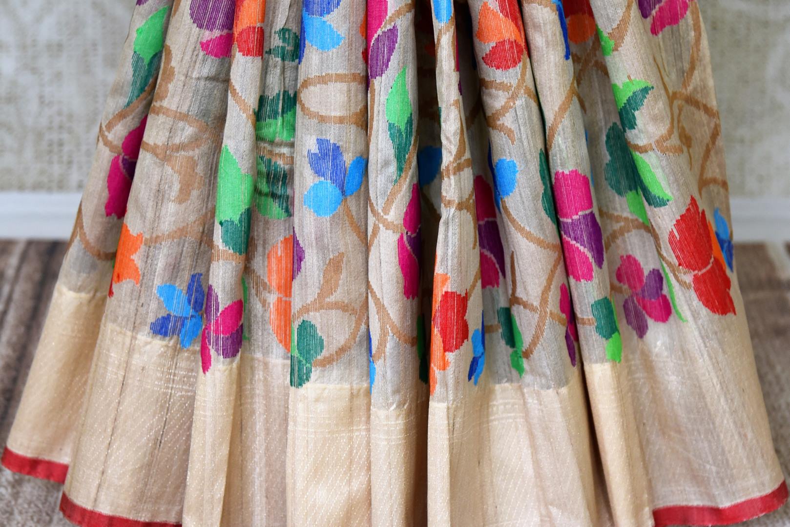 Bring radiance to your ethnic look with this beige tussar Benarasi saree with bright floral border on festive occasions. It comes with a matching blouse piece. Shop online at Pure Elegance or visit our store in USA.