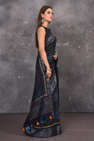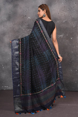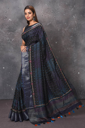 A beautiful black pure elegance silk saree, bedecked with traditional Bisoni design on the Pallu, woven in Muga Ghicha silk and silver Guna (zari) work. Complemented by an unstiched elegant blouse. A handwoven product comes with its own nuances and that is what makes it unique. Muga/ Mooga silk produce from the Antheraea assamensis silkworm feed aromatic plant in Assam, this silk worm produced lustrous glossy golden tint silk. Its luster increases after every wash.