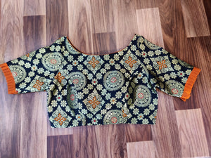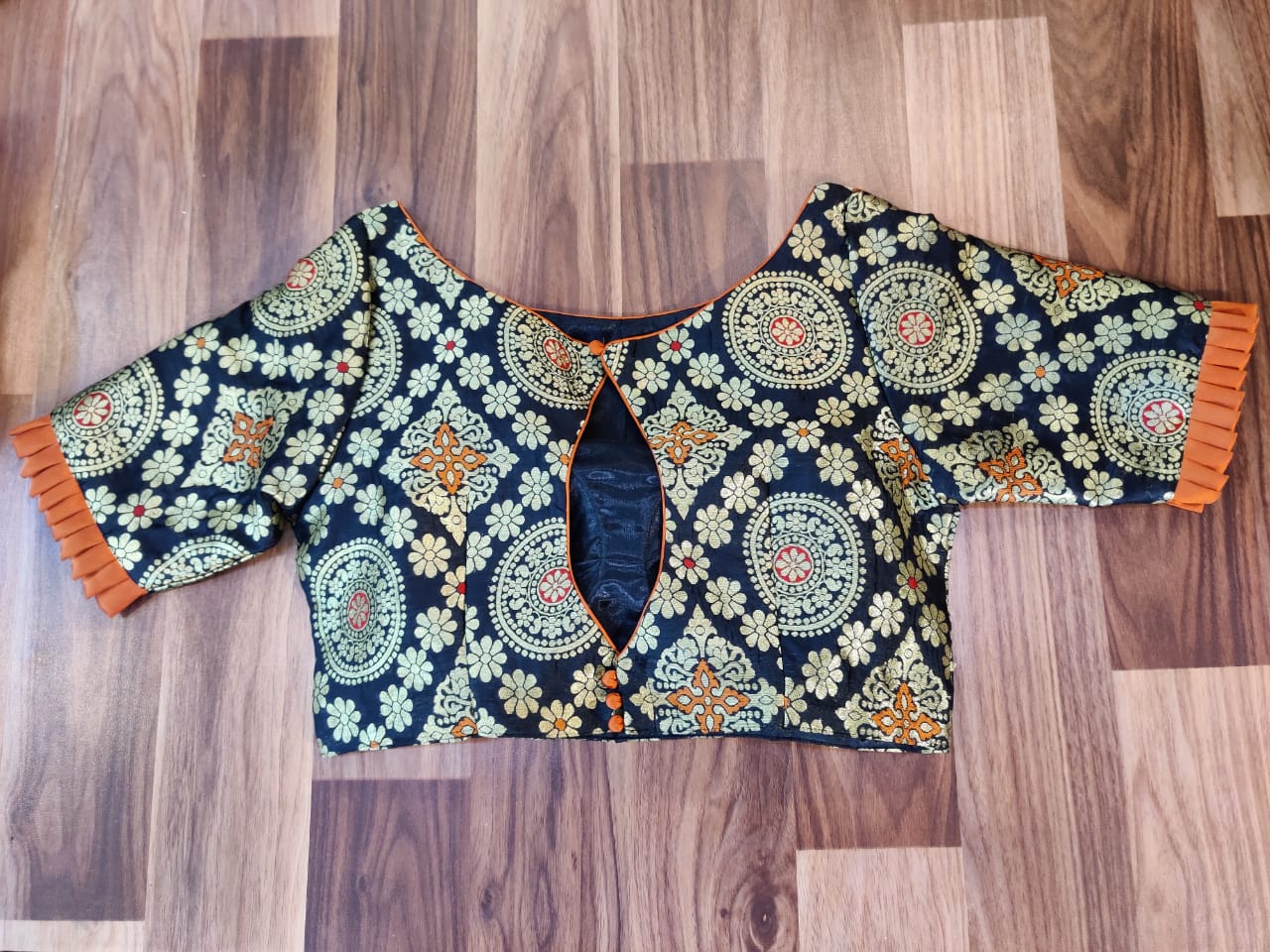 Beautiful black Banarasi saree blouse with orange frill sleeves. Shop designer saree blouse online in USA from Pure Elegance.