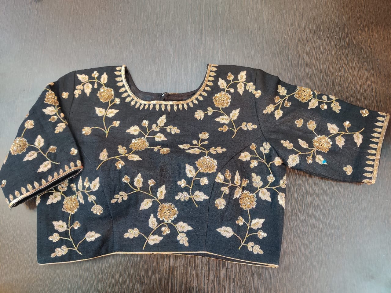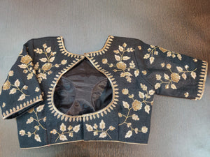 Beautiful black designer sari blouse with golden embroidery. Buy designer blouse in USA from Pure Elegance.