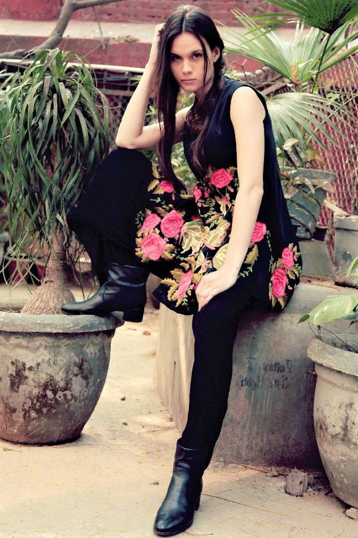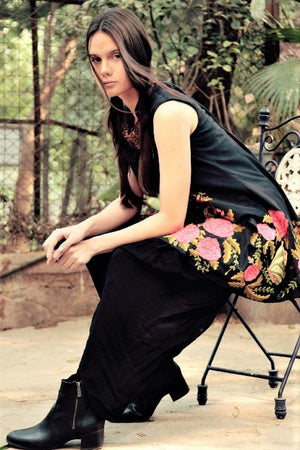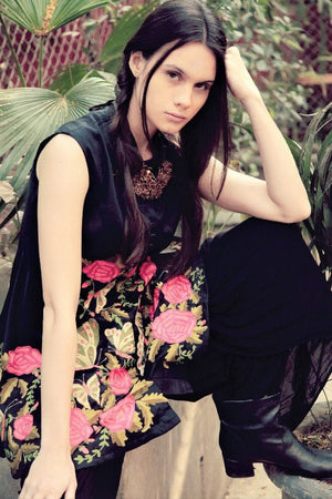 Classy black flared jacket with embroidered roses and butterfly is a stylish pick for an Indowestern style. The jacket is paired with black dhoti pants.