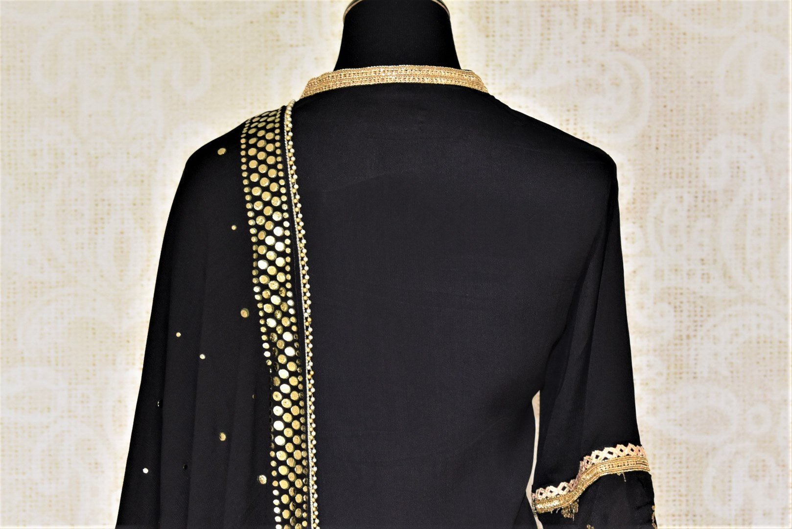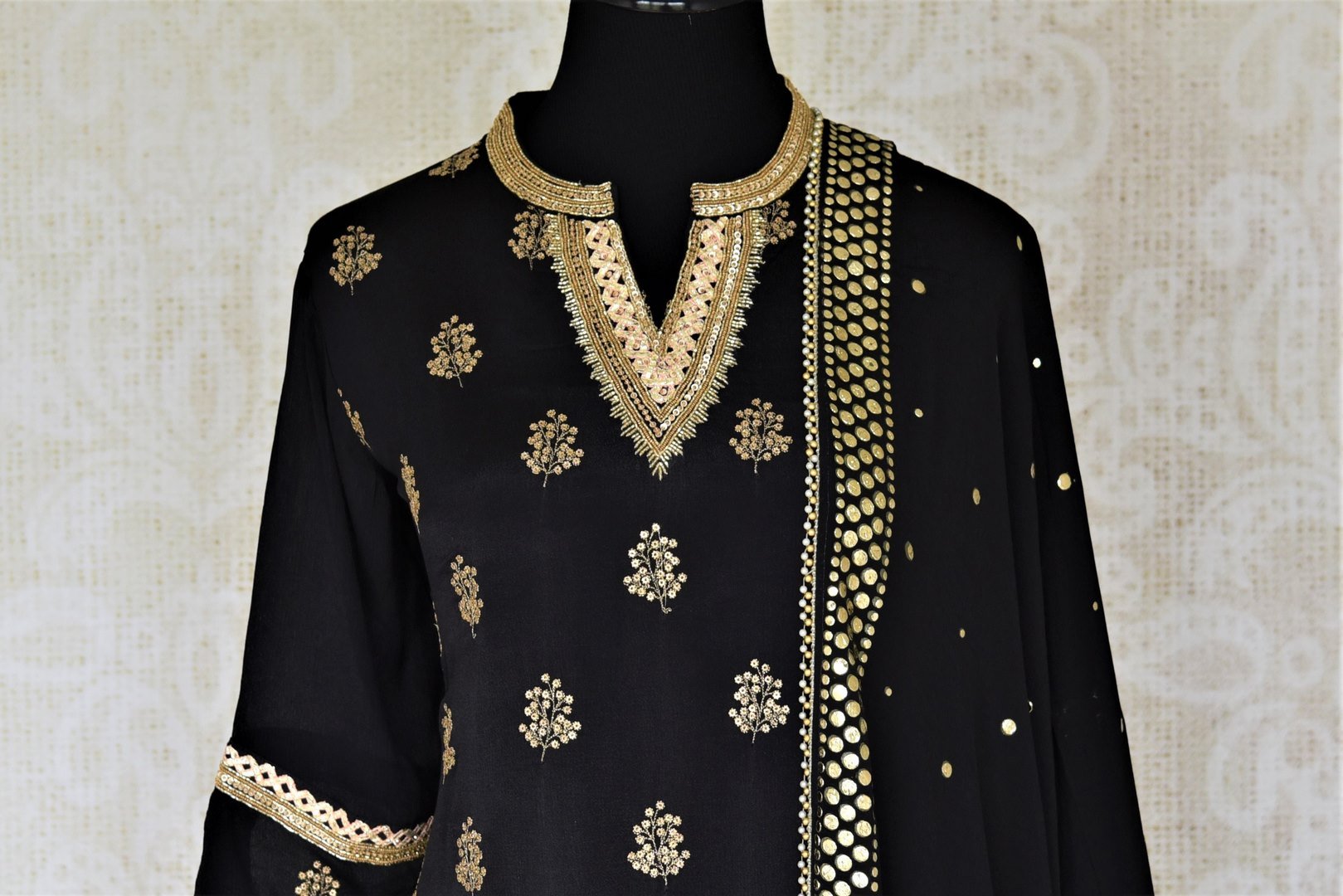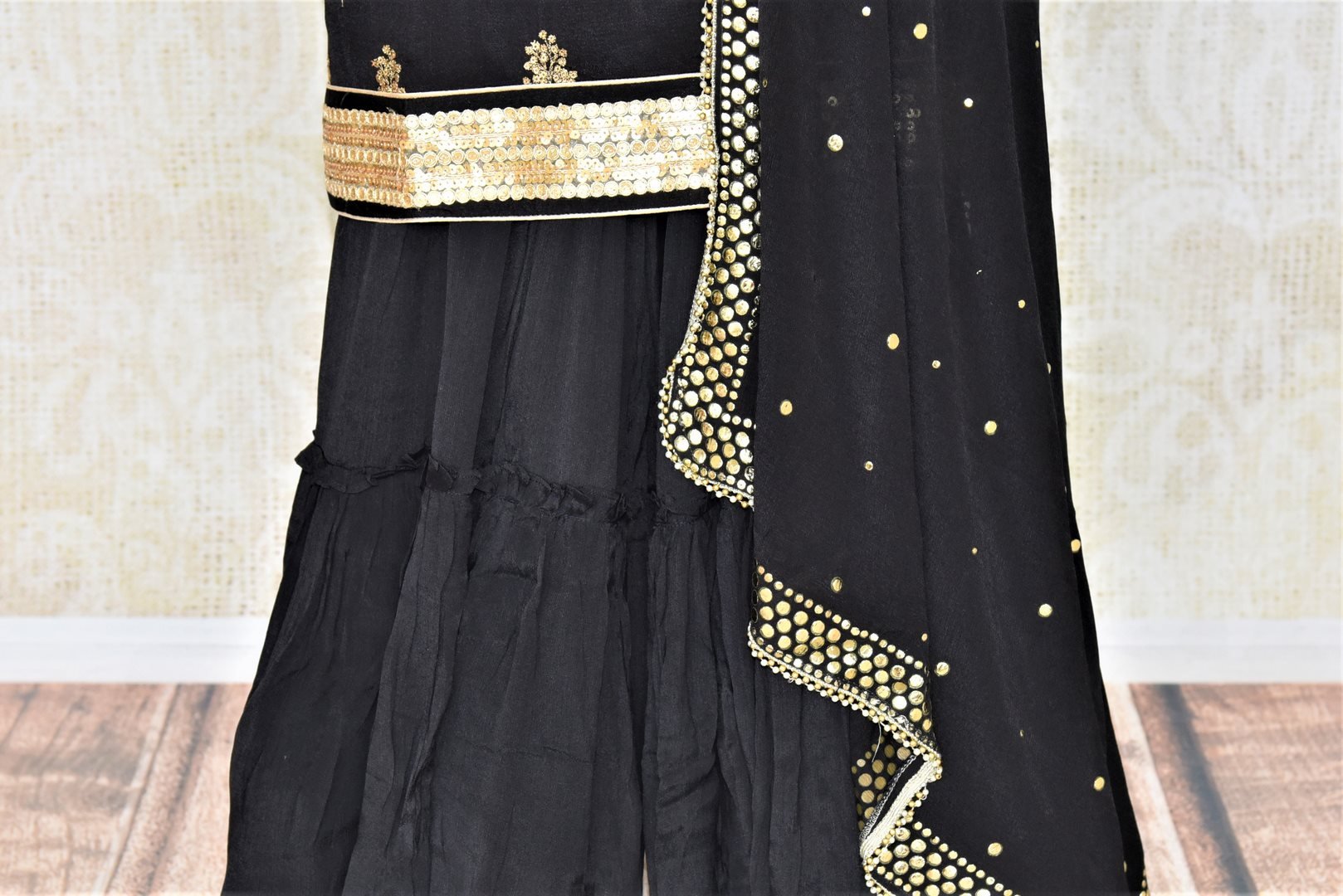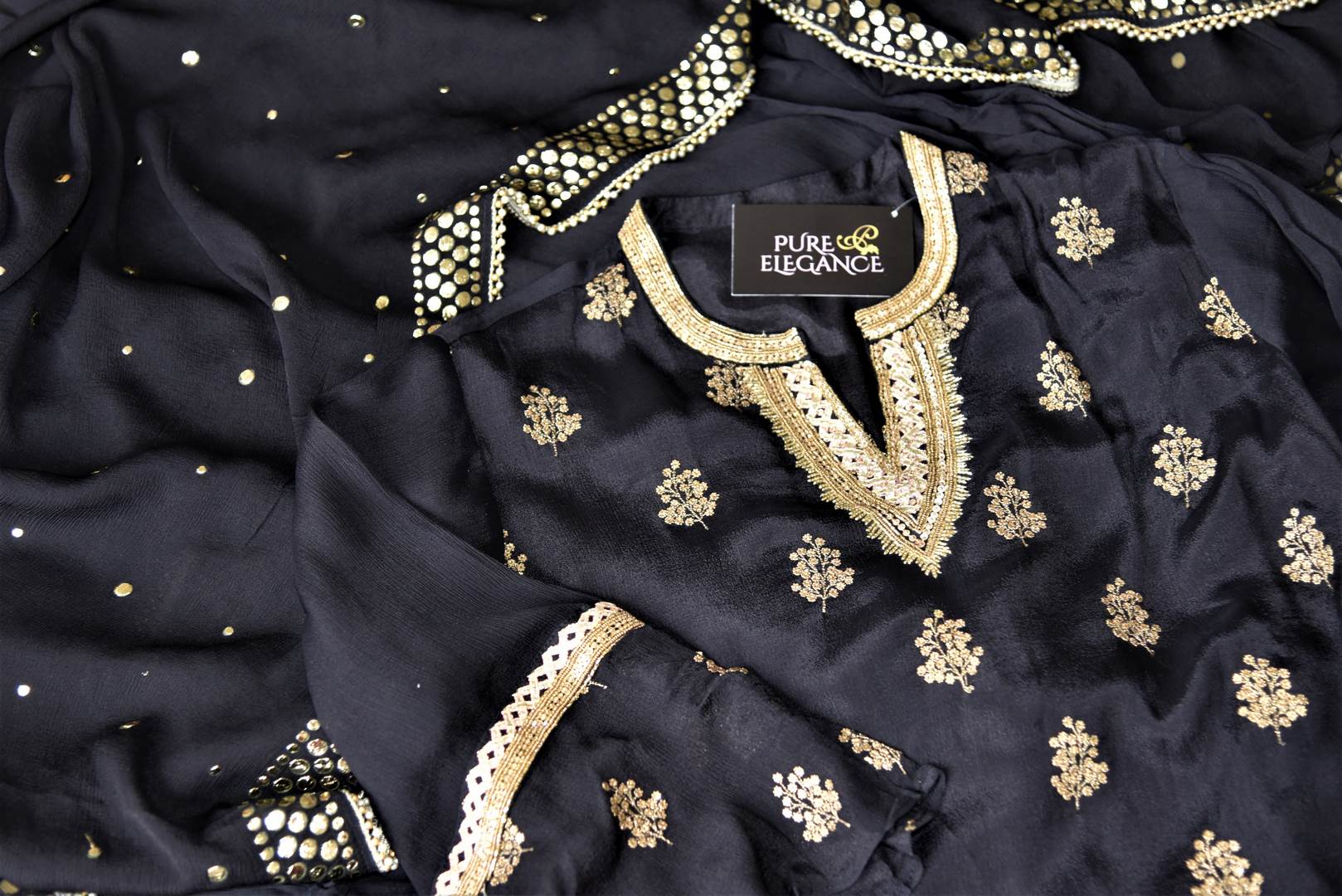 Attractive black embroidered crepe silk sharara suit for special occasions! The suit comes with a matching dupatta. Shop online designer suits in USA from Pure Elegance.