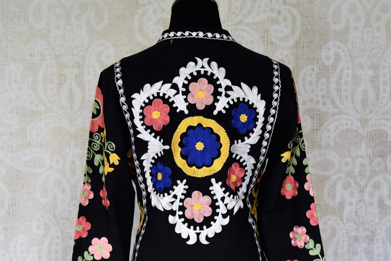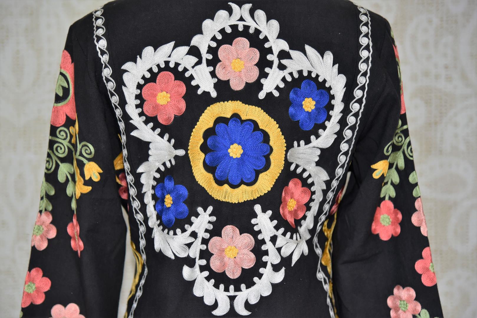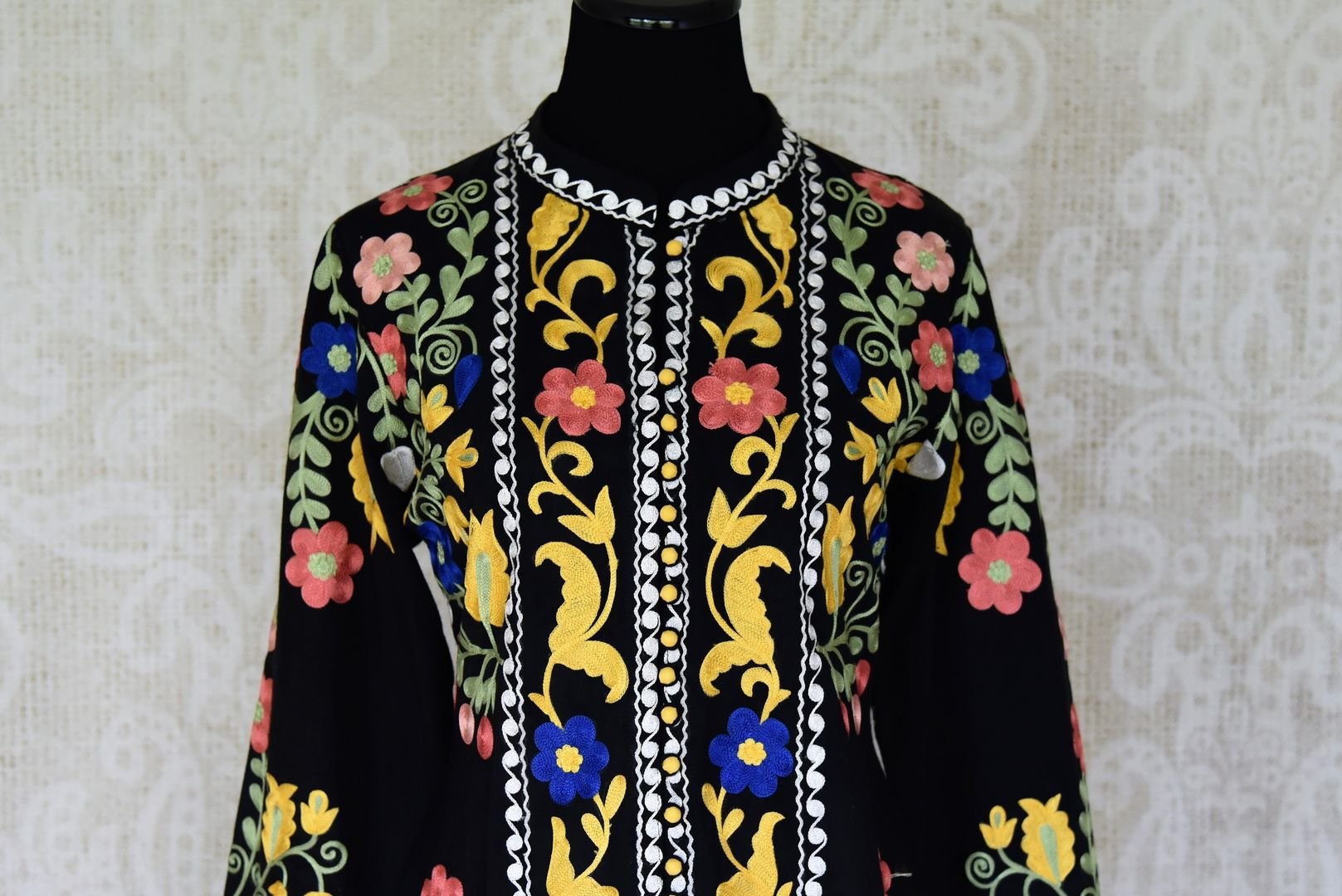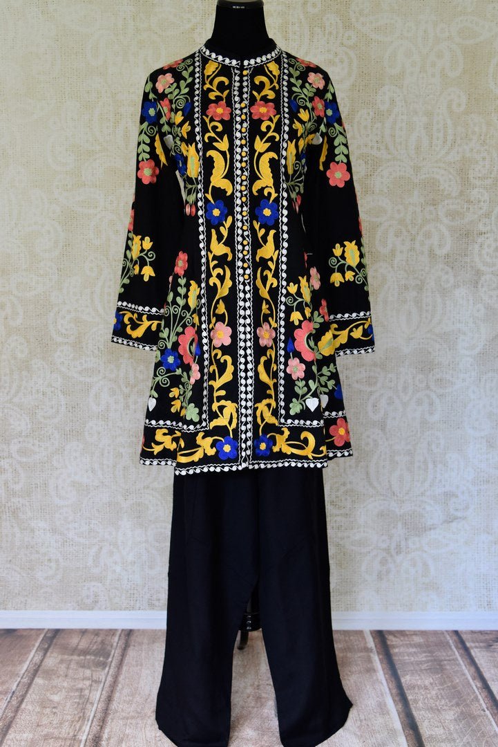Black color embroidered linen suit with palazzo special occasions. It is adorned with bright floral embroidery. Shop online at Pure Elegance or visit our store in USA.