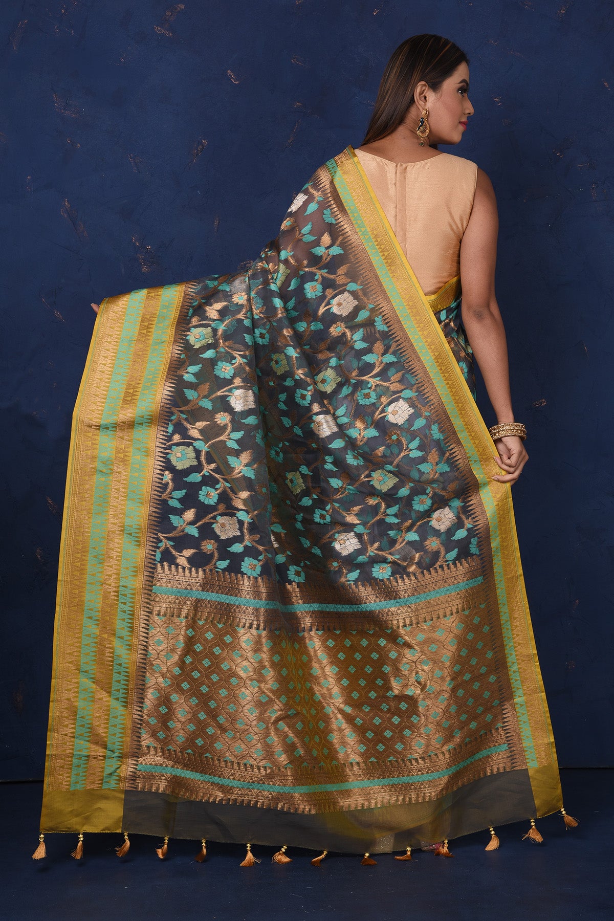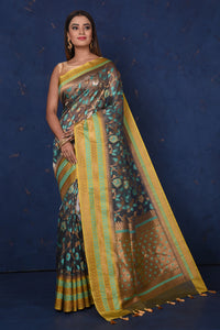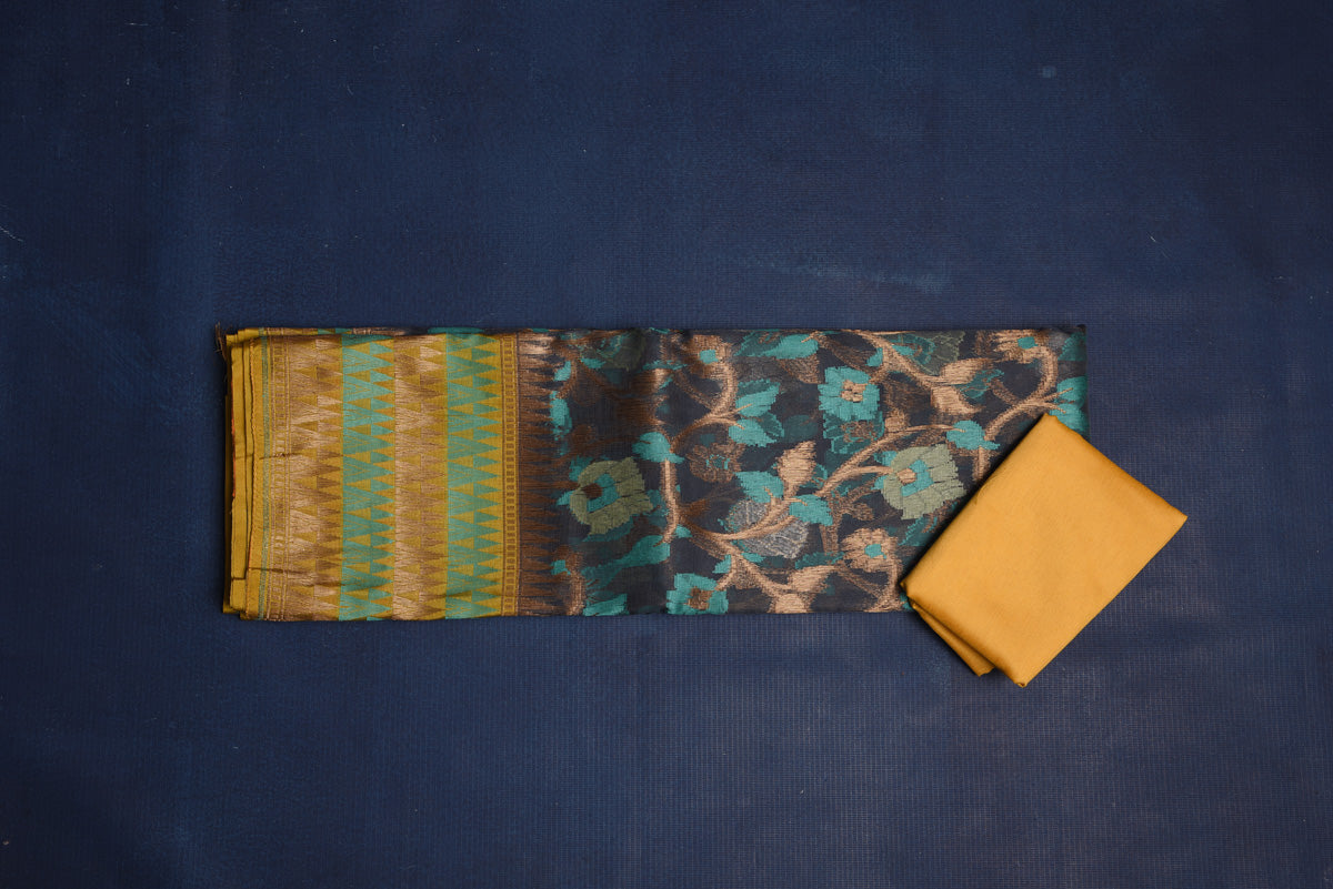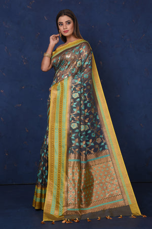 Be the talk of the occasion in this stunning black floral fancy Kora saree with green and golden border and pallu. It comes with a matching blouse piece. Shop silk sarees in USA from Pure Elegance.