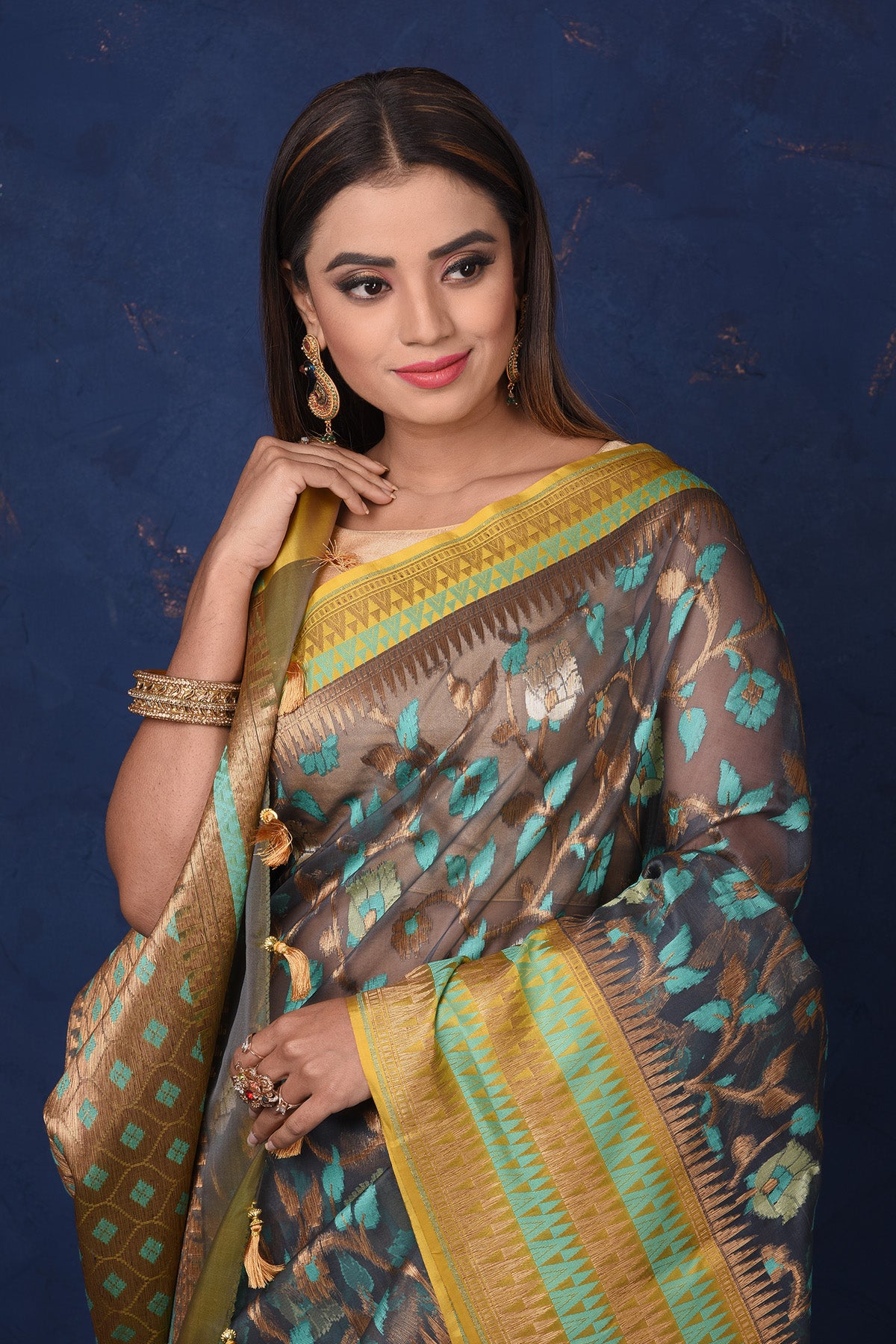 - The shown stitched blouse on the model is for display purpose only. The saree comes with a matching blouse piece and finished with fall and piko.