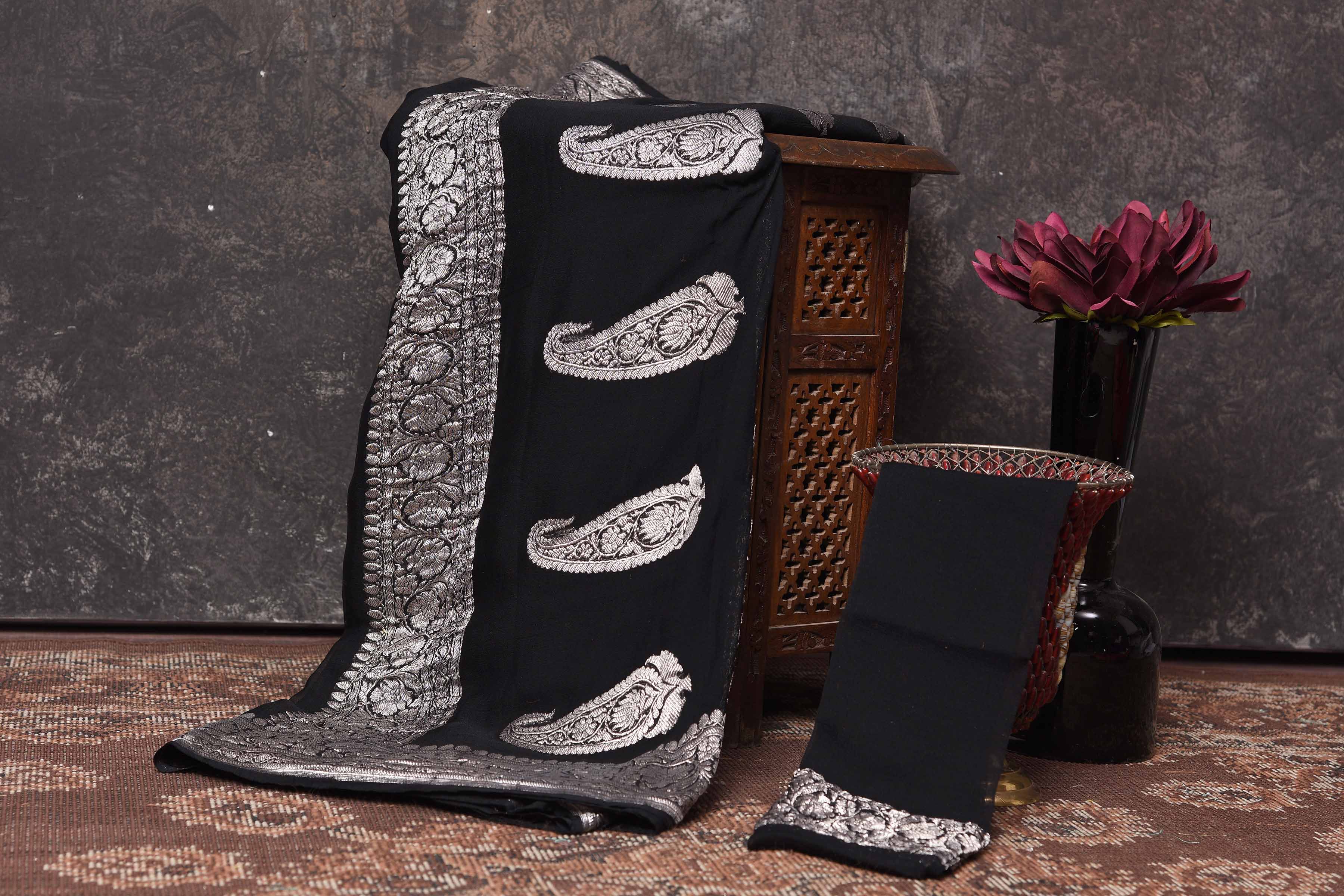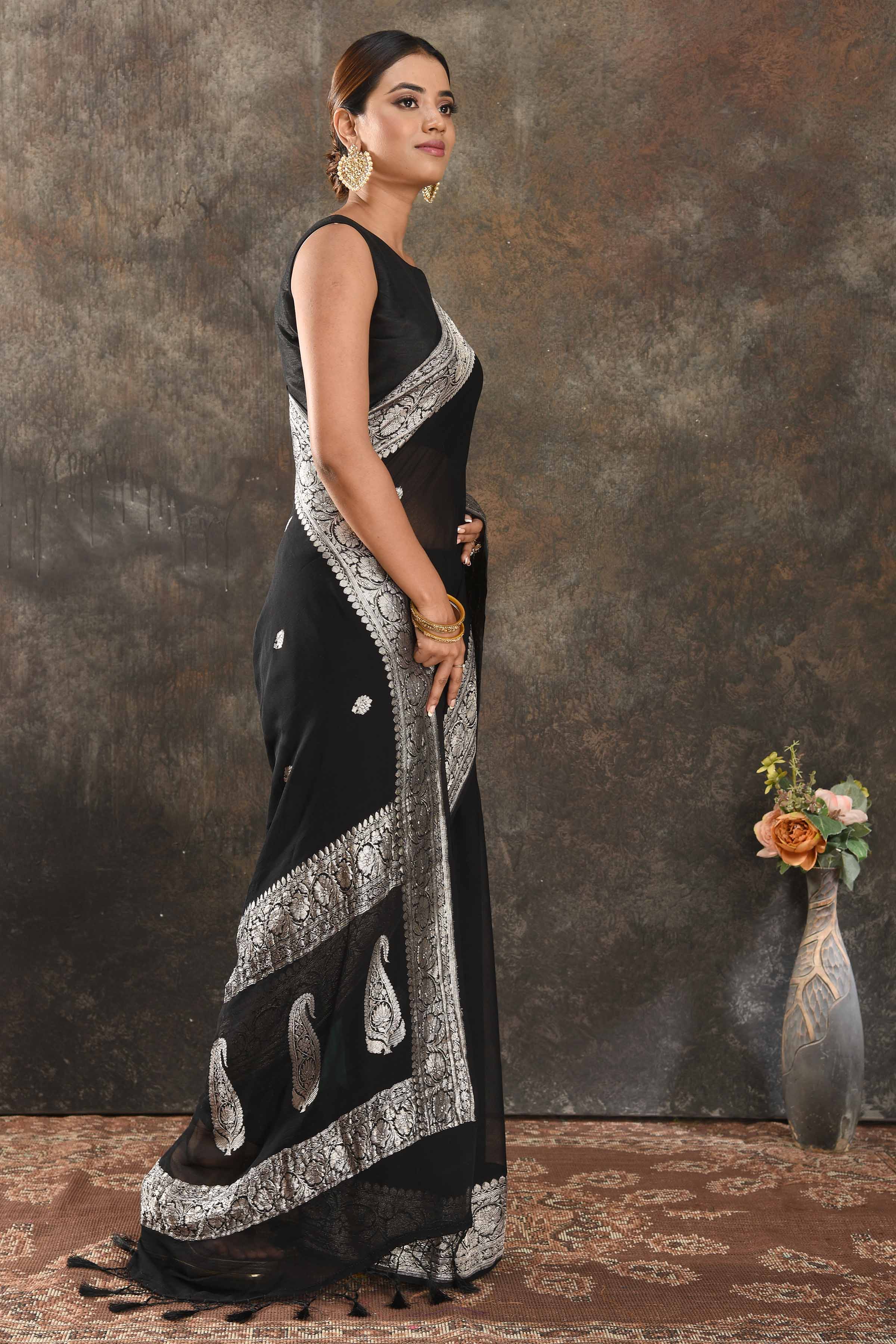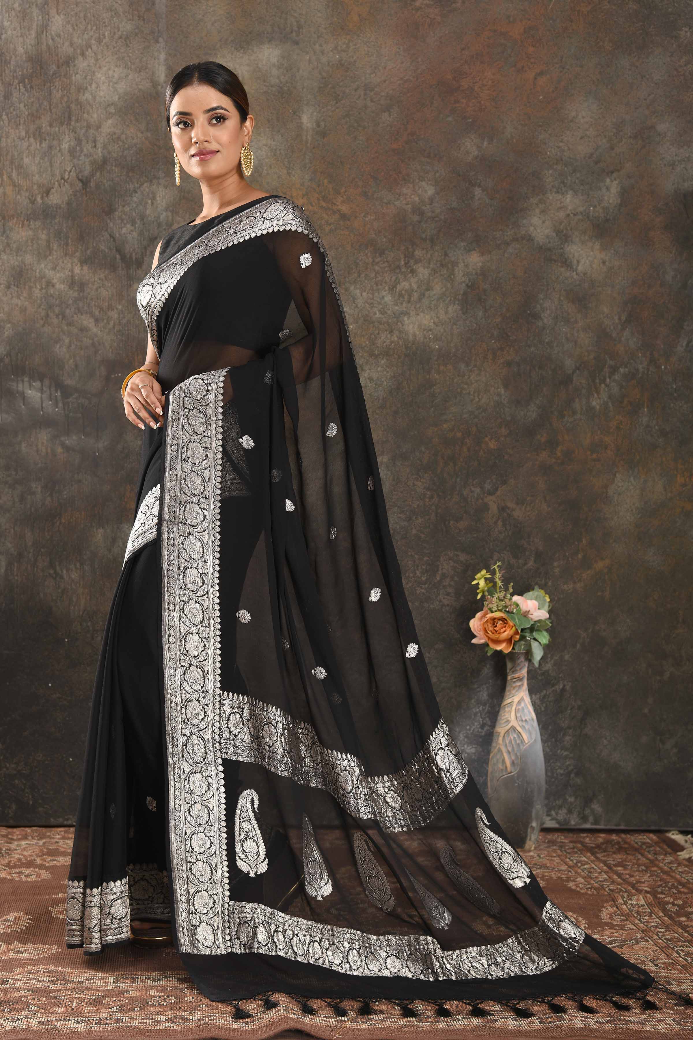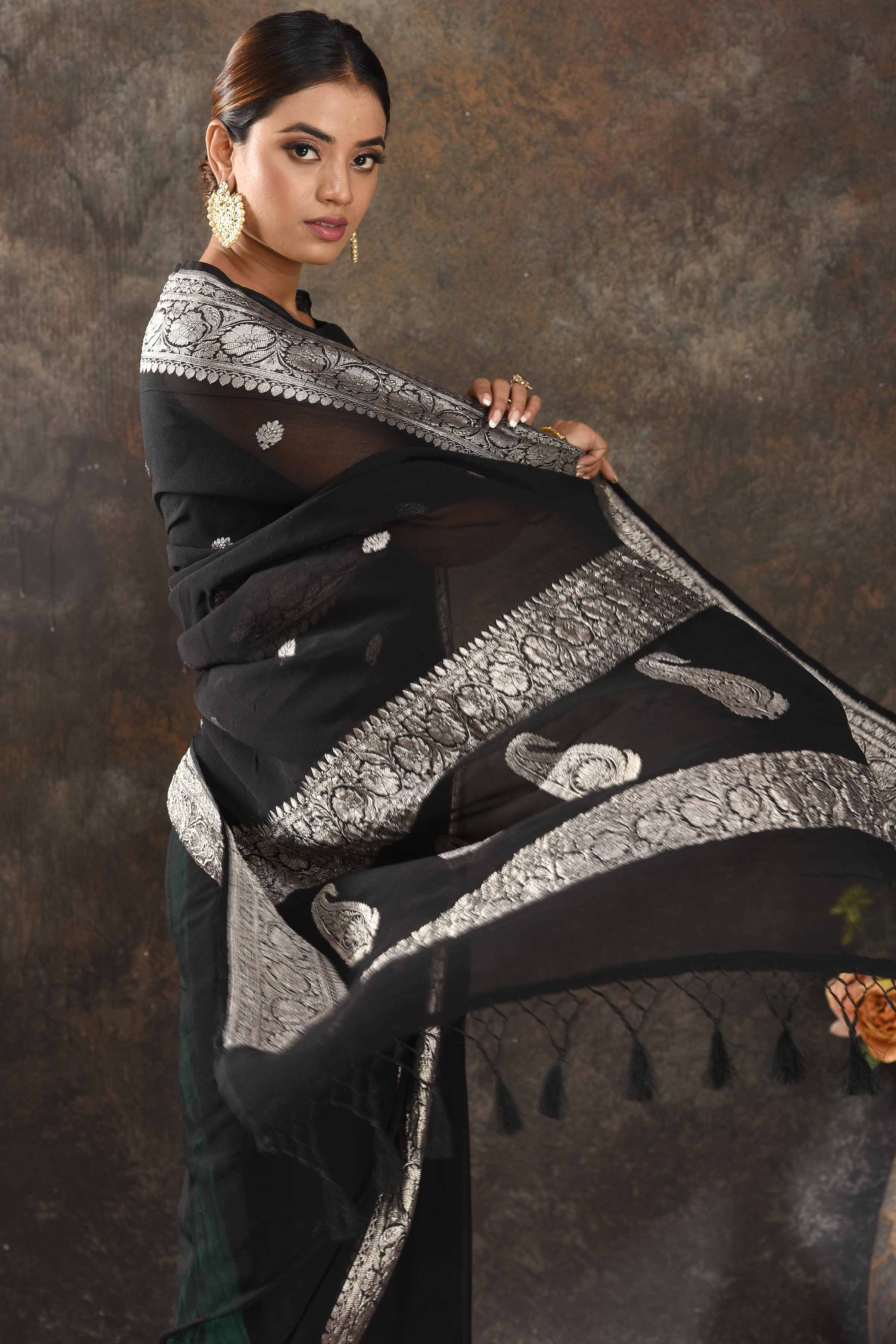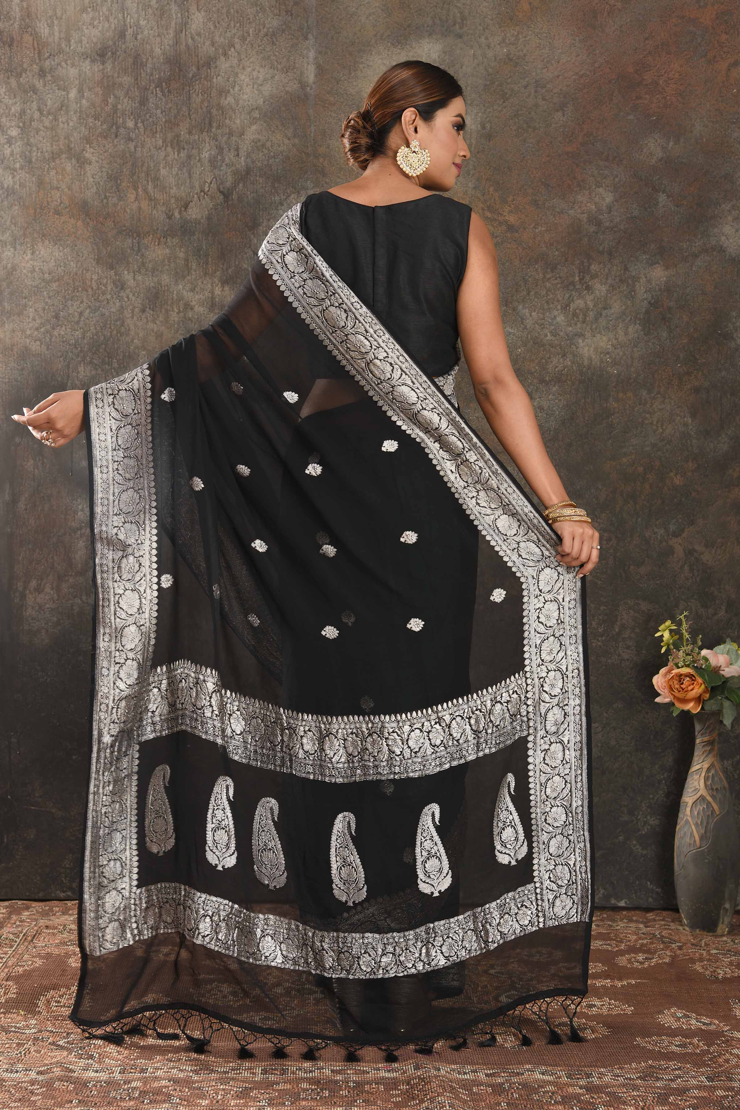 Be vision of elegance on special occasions in this stunning black georgette Banarasi saree. The saree is enhanced with silver zari border and buta. It comes with a matching blouse piece.