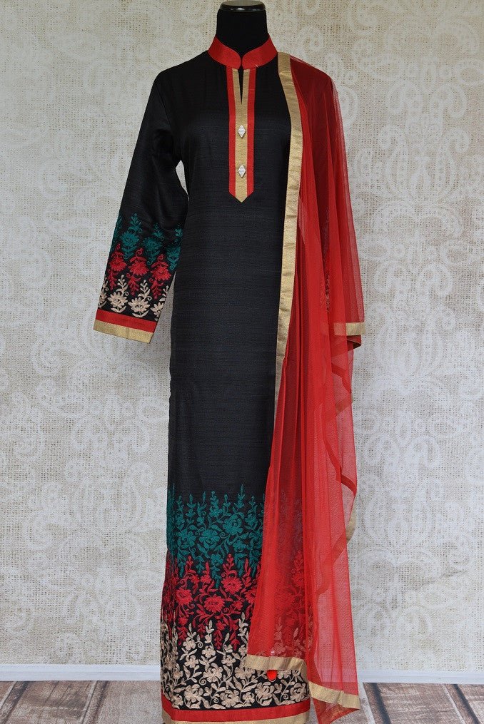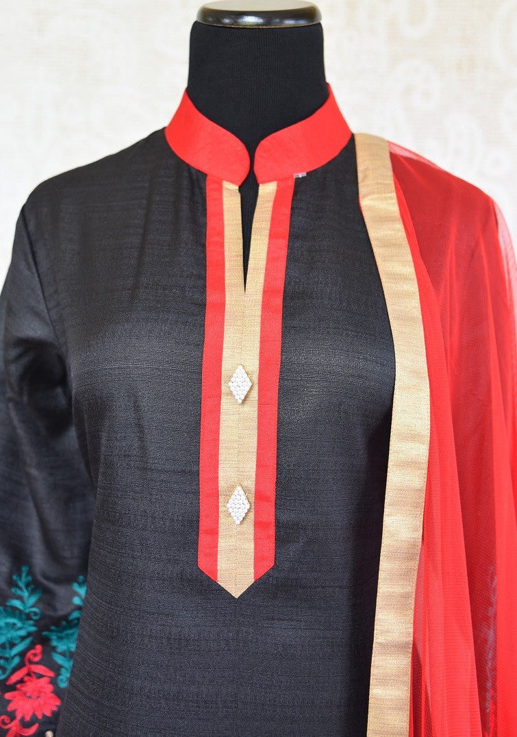 501292 Black Raw Silk Embroidered Suit with Red Dupatta
