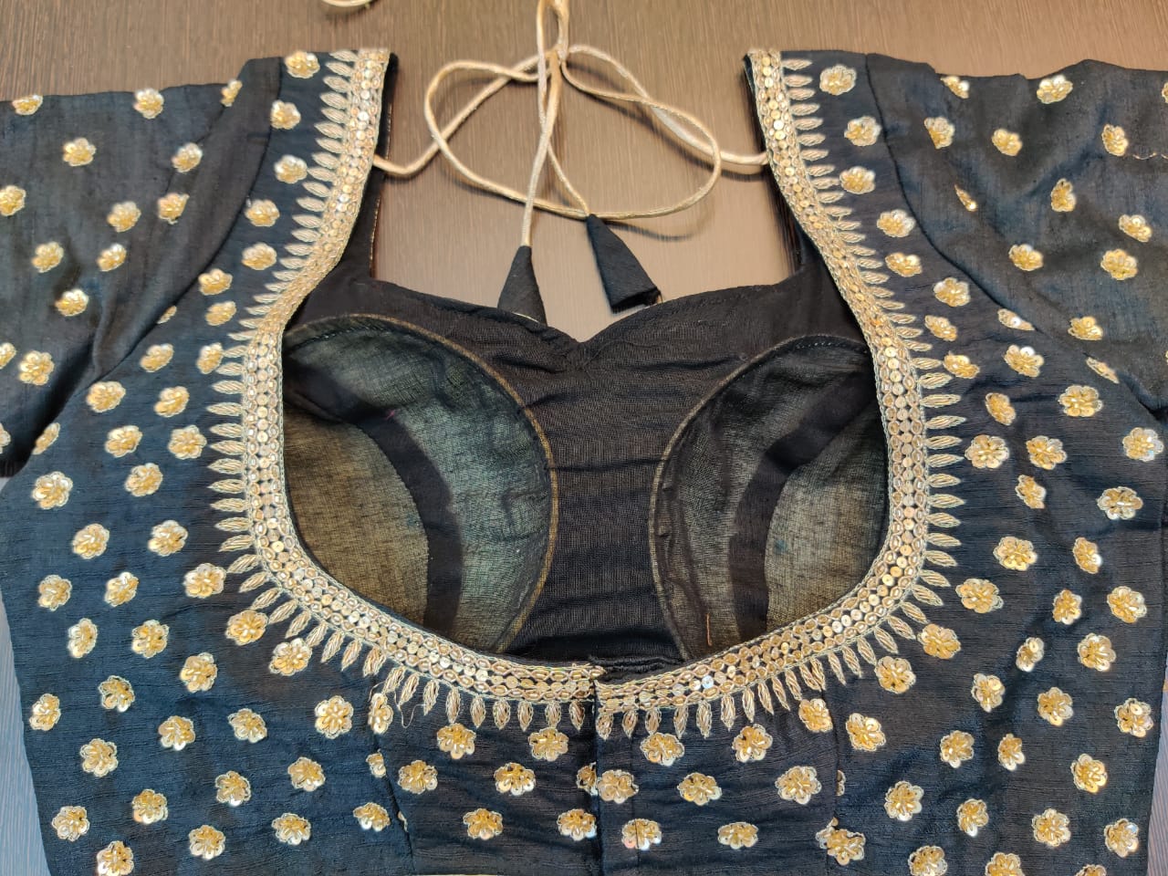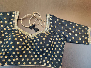 Stunning black readymade sari blouse with golden embroidery. Buy online from Pure Elegance