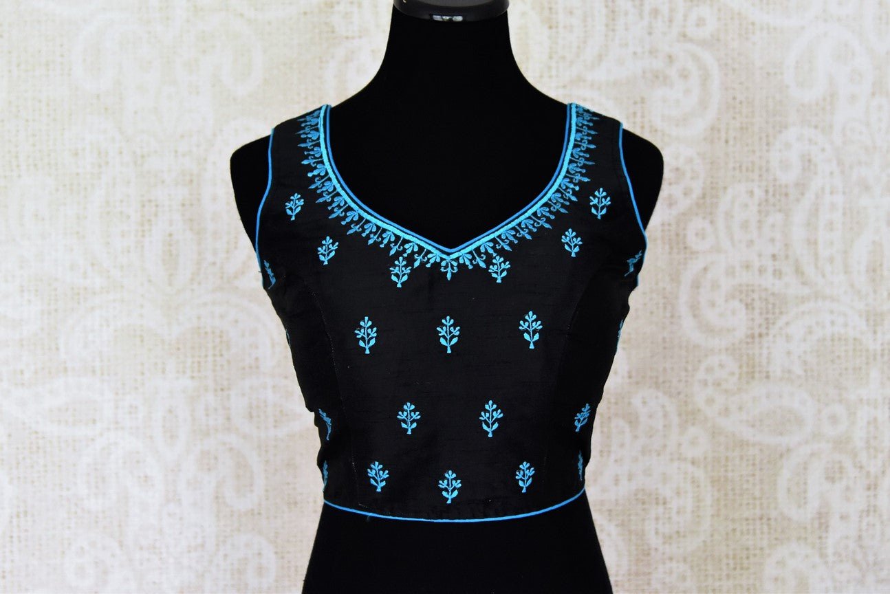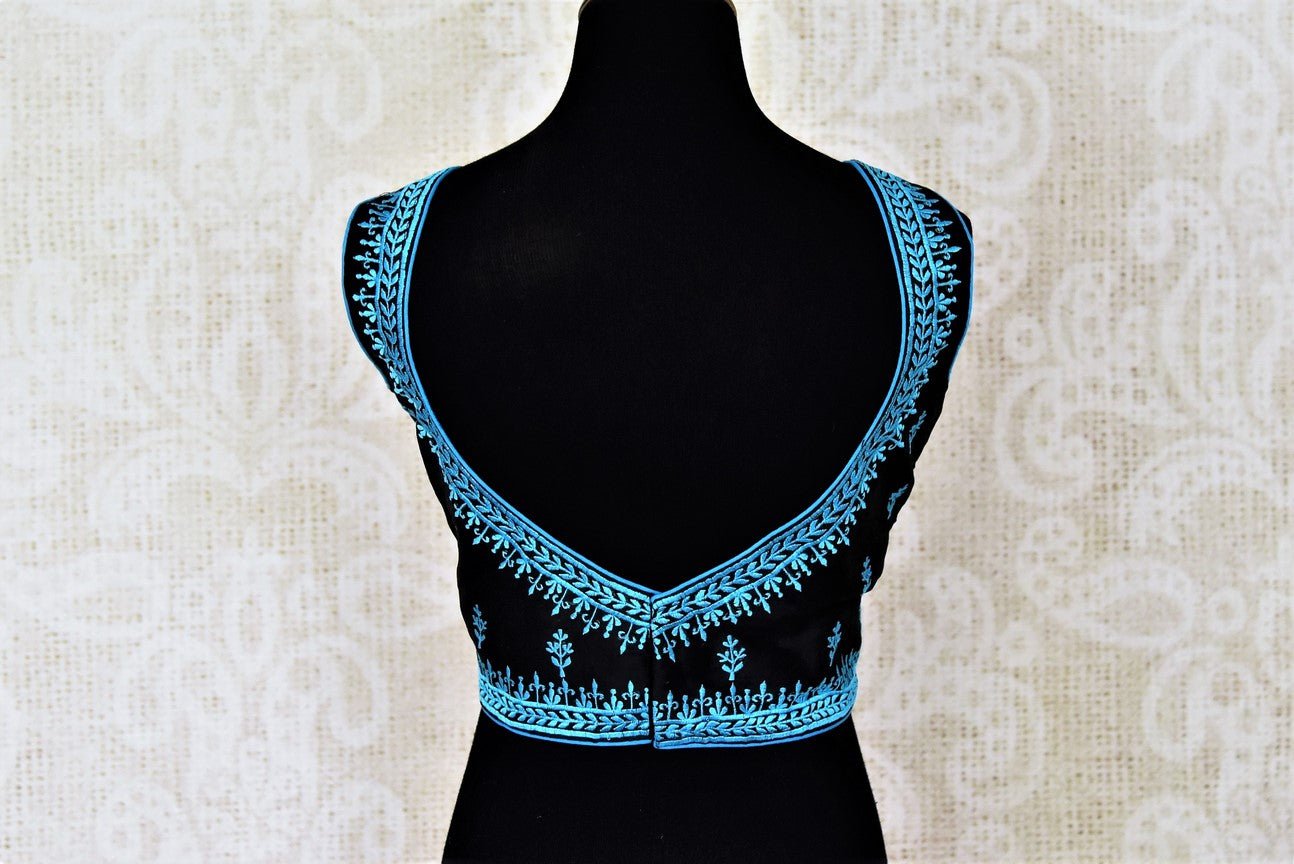 Beautiful black sleeveless silk saree blouse with blue embroidery.