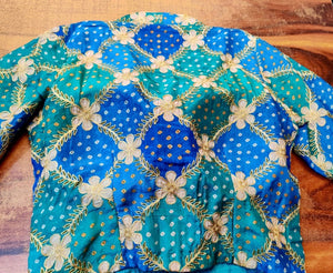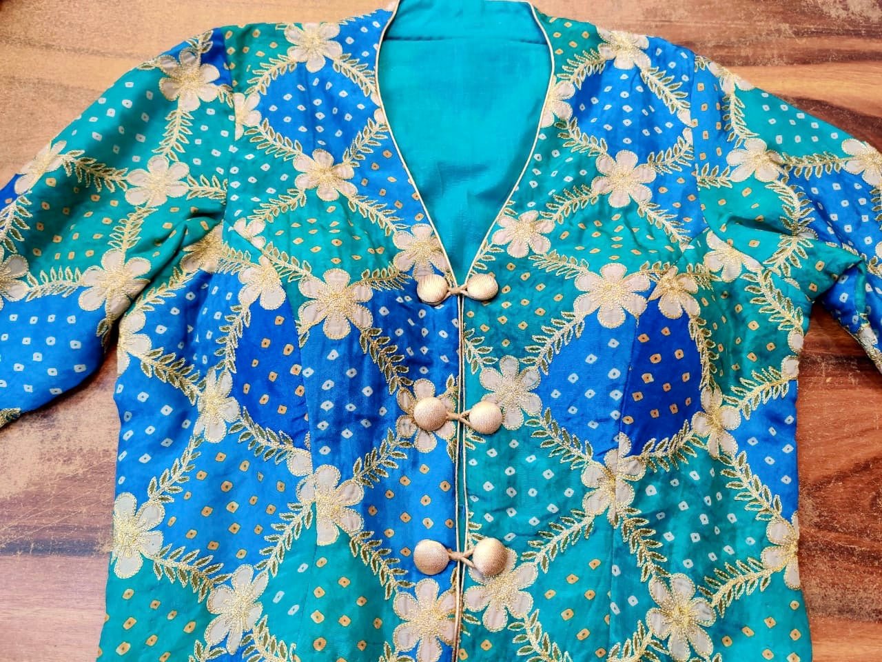 Stunning blue bandhej silk embroidered designer designer saree blouse. Buy online from Pure Elegance