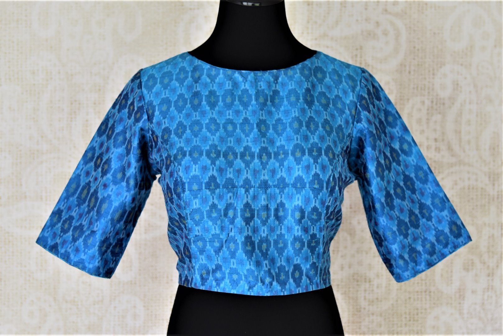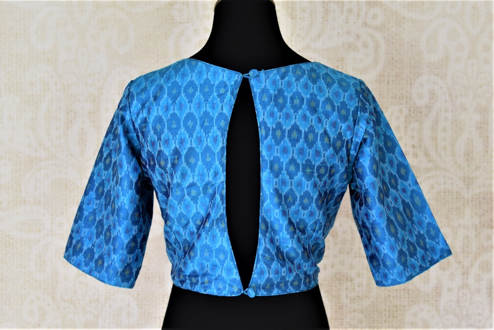 Stunning blue ikkat silk saree blouse with key hole back. Shop designer saree blouses in USA from Pure Elegance.