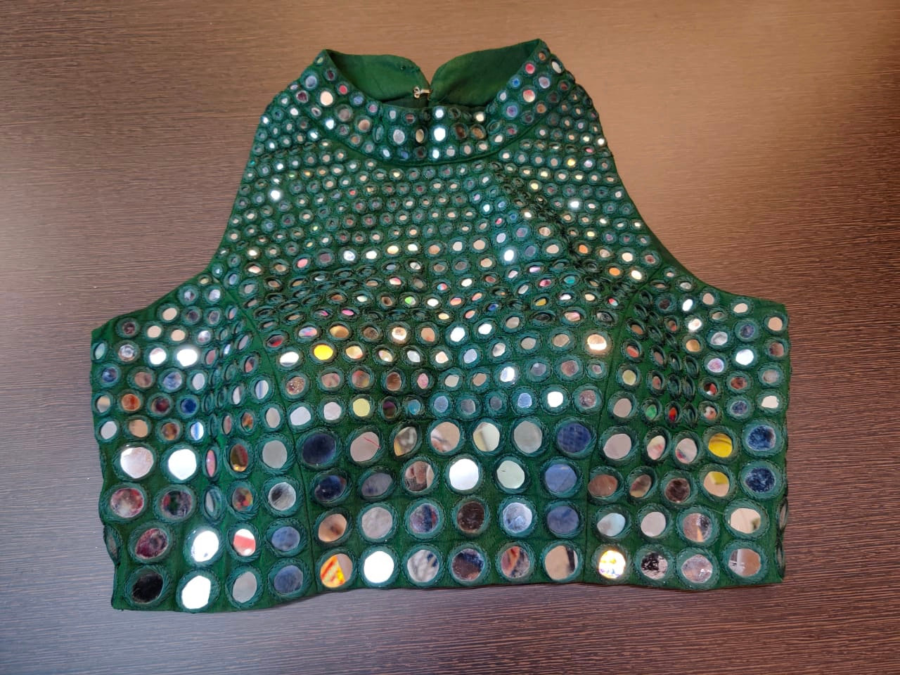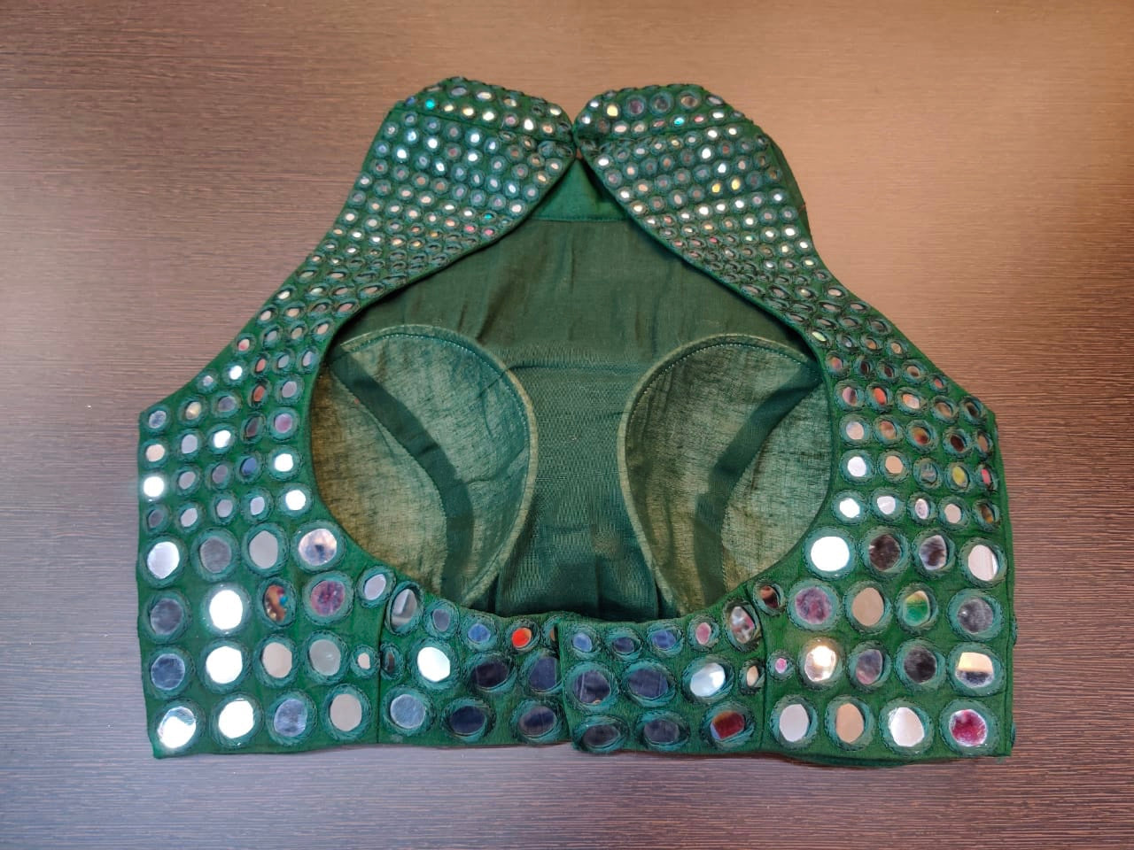 Gorgeous bottle green color mirror work high neck saree blouse. Shop designer saree blouse online in USA from Pure Elegance.