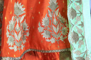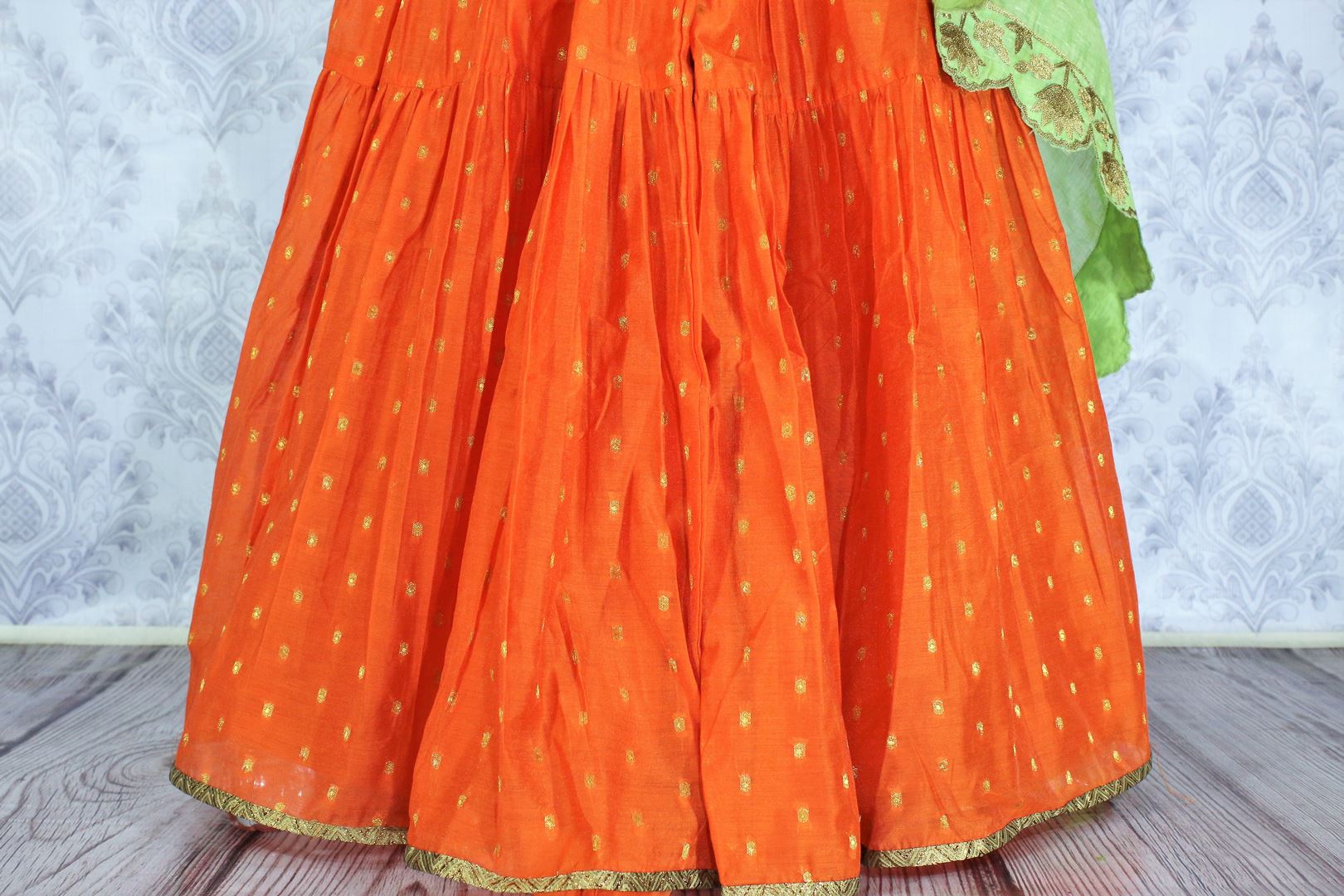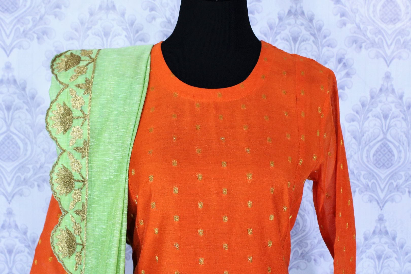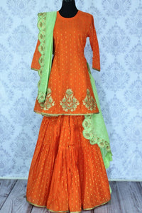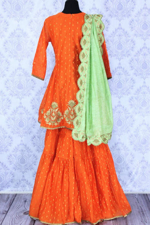 Stand out in the bright colors of orange sharara suit with dupatta at parties and special occasions. The overall buta with embroidered motifs makes the outfit all the more alluring. It comes with a pastel green dupatta. Buy online from Pure Elegance or visit our store in USA.