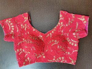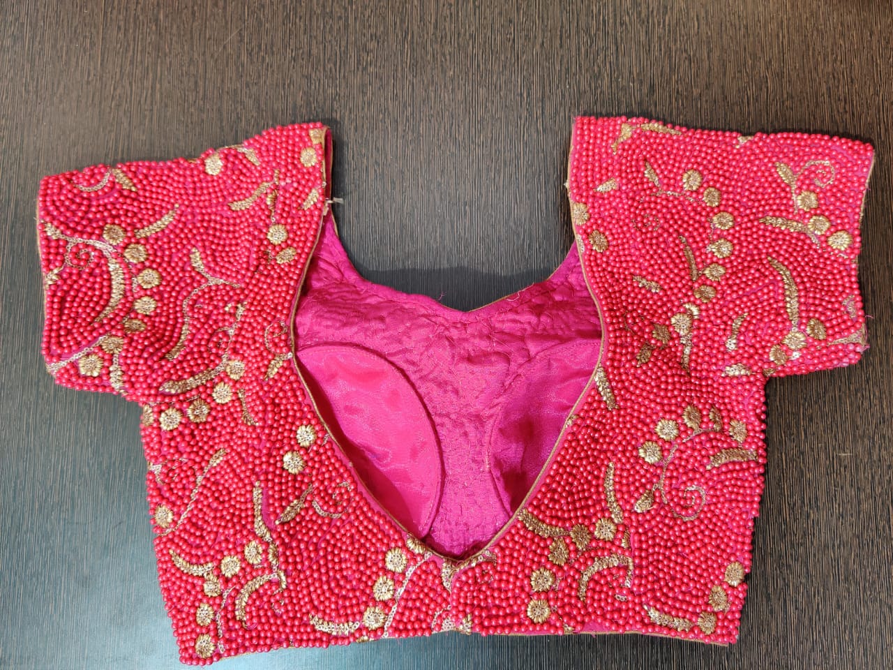 Stunning bright pink pearl embroidery designer sari blouse. Shop designer saree blouse online in USA from Pure Elegance.