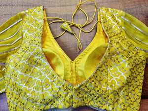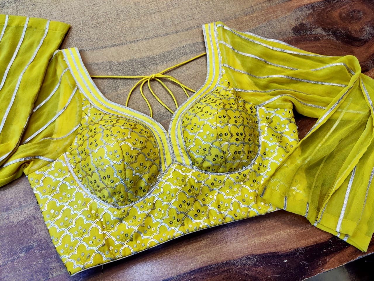 Gorgeous bright yellow embroidered designer saree blouse. Buy online from Pure Elegance