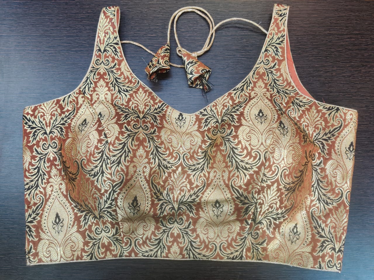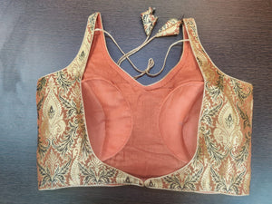 Stunning brown sleeveless readymade Banarasi saree blouse. Buy designer blouse in USA from Pure Elegance.