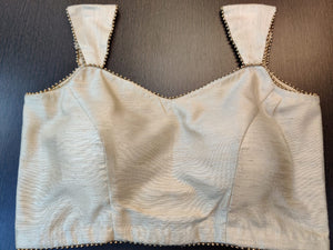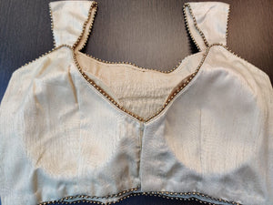 Beautiful cream designer saree blouse with golden beads lace. Buy online from Pure Elegance