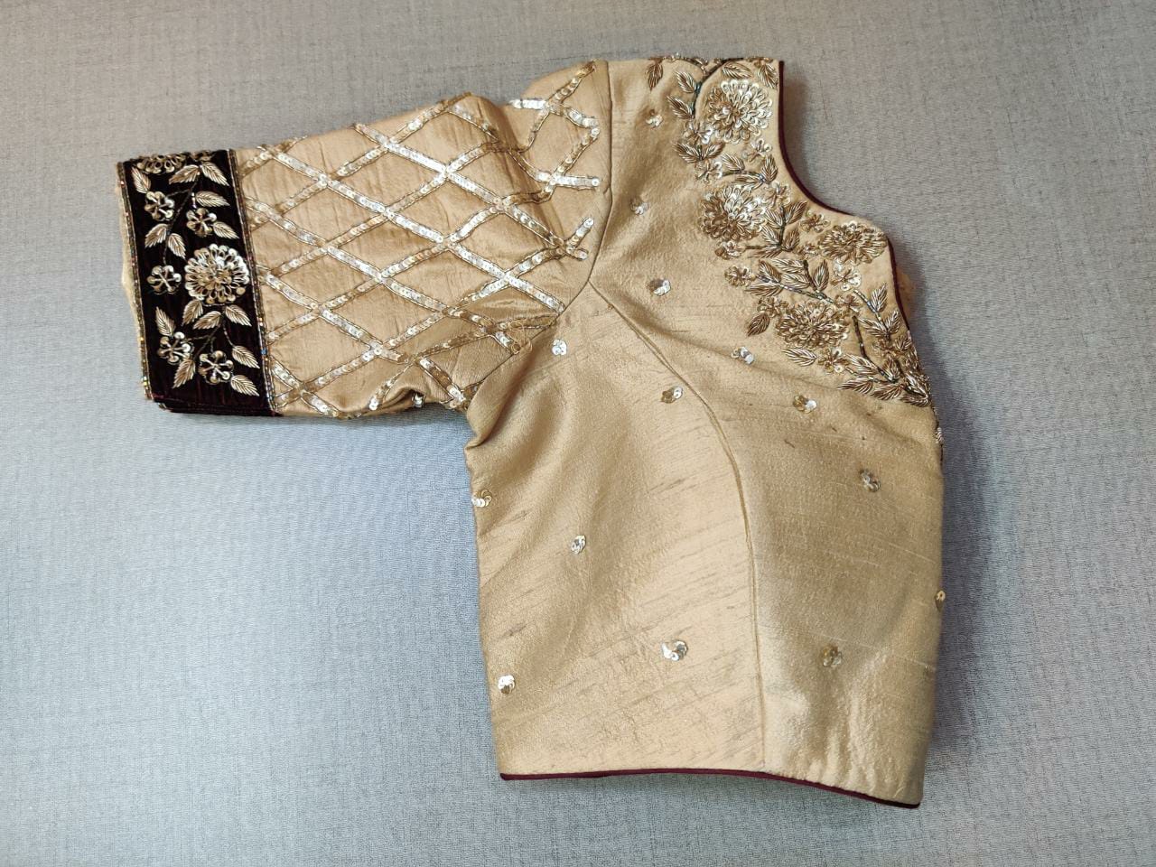 Add cream floral embroidered designer saree blouse crafted with beautiful floral pattern on it. Buy readymade saree blouse in USA from Pure Elegance..