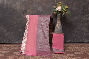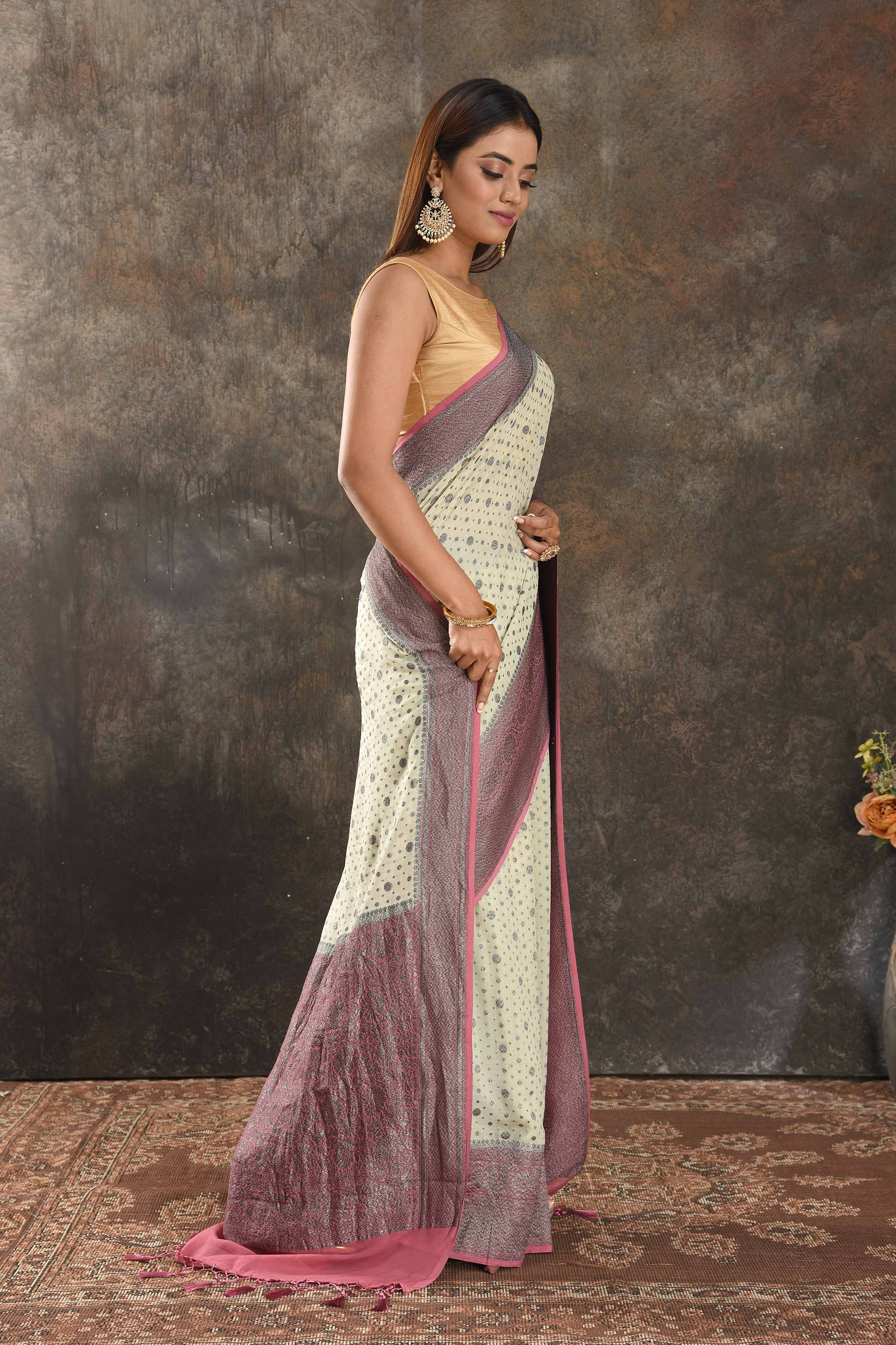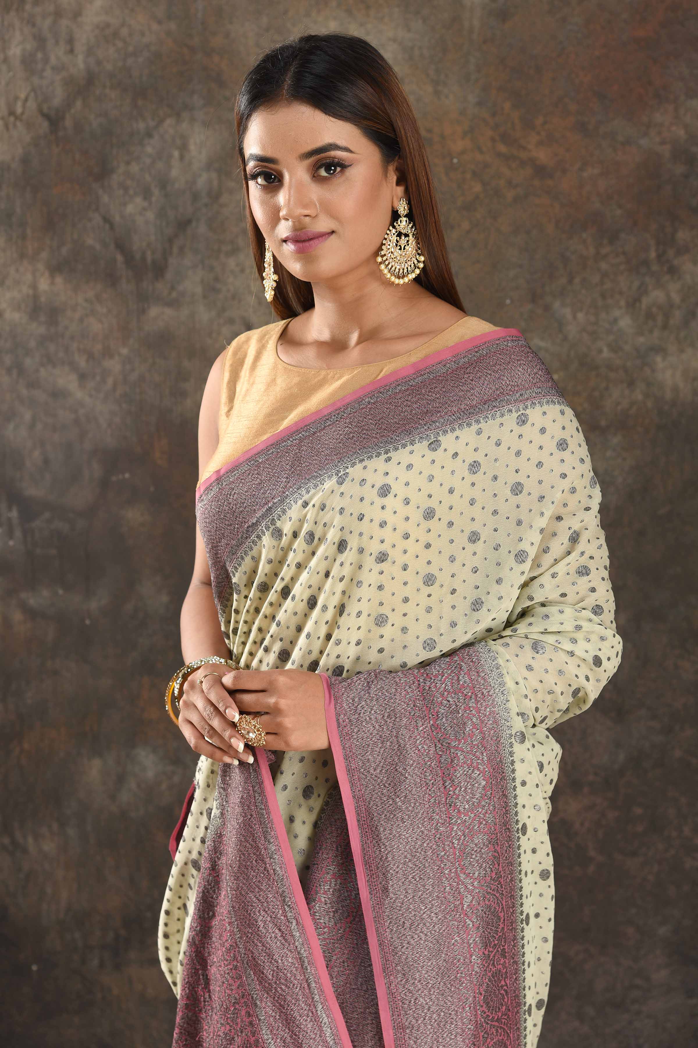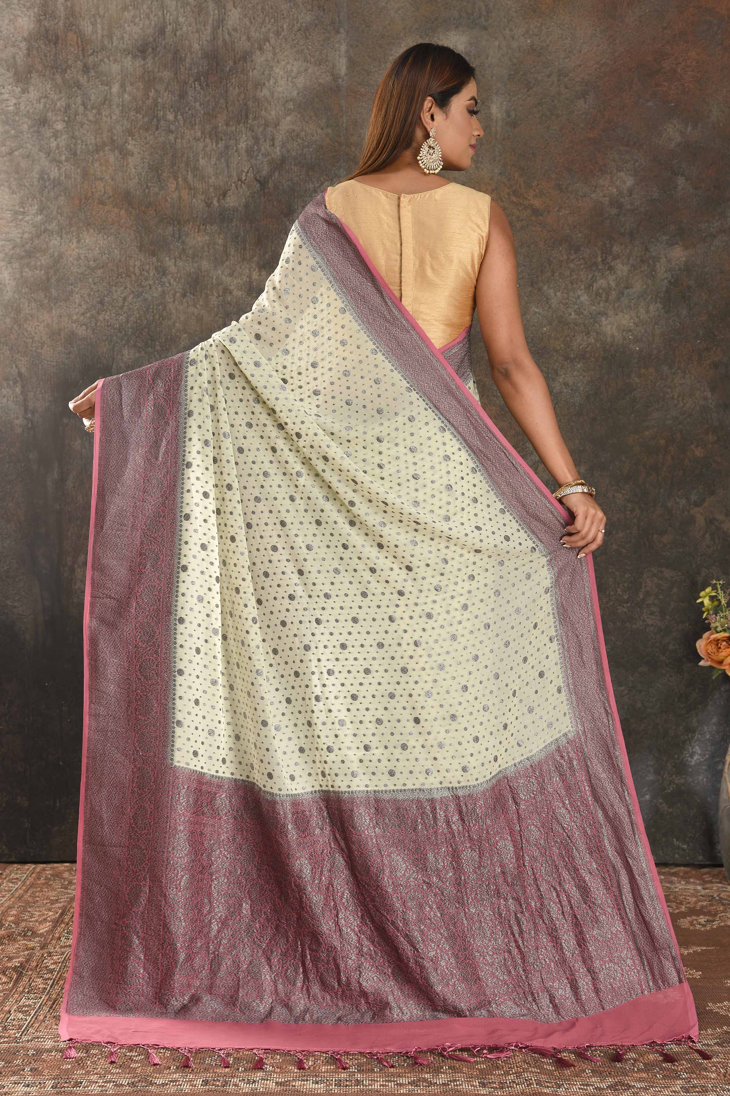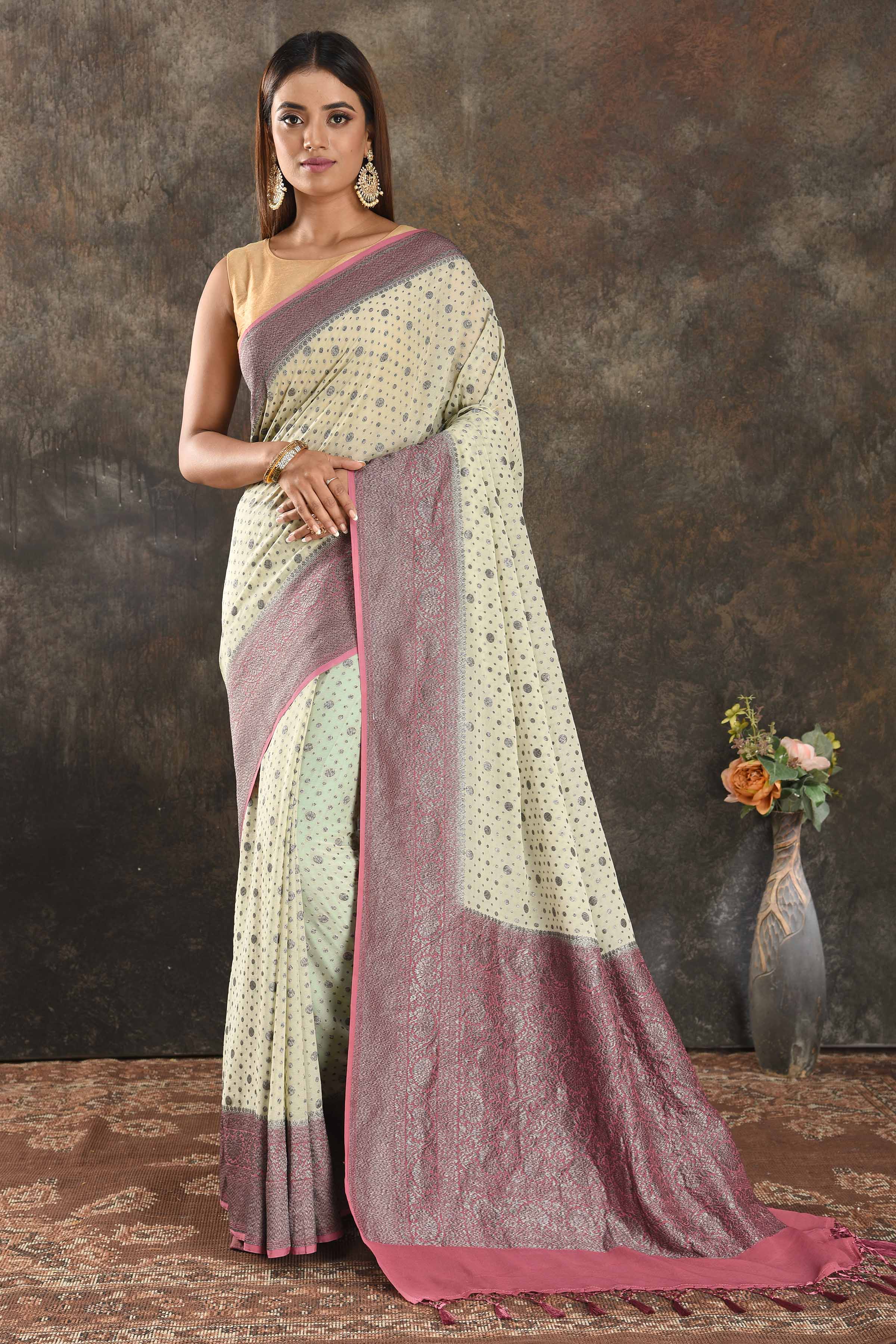 Be vision of elegance on special occasions in this cream georgette sari. The saree is enhanced with antique zari buta and antique zari pink border. It comes with a matching blouse piece.