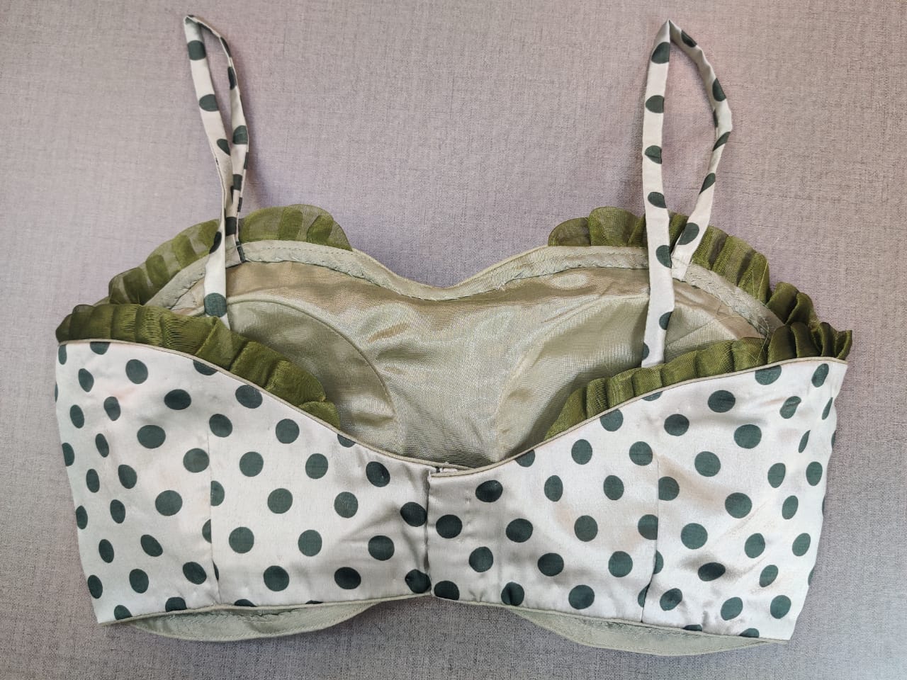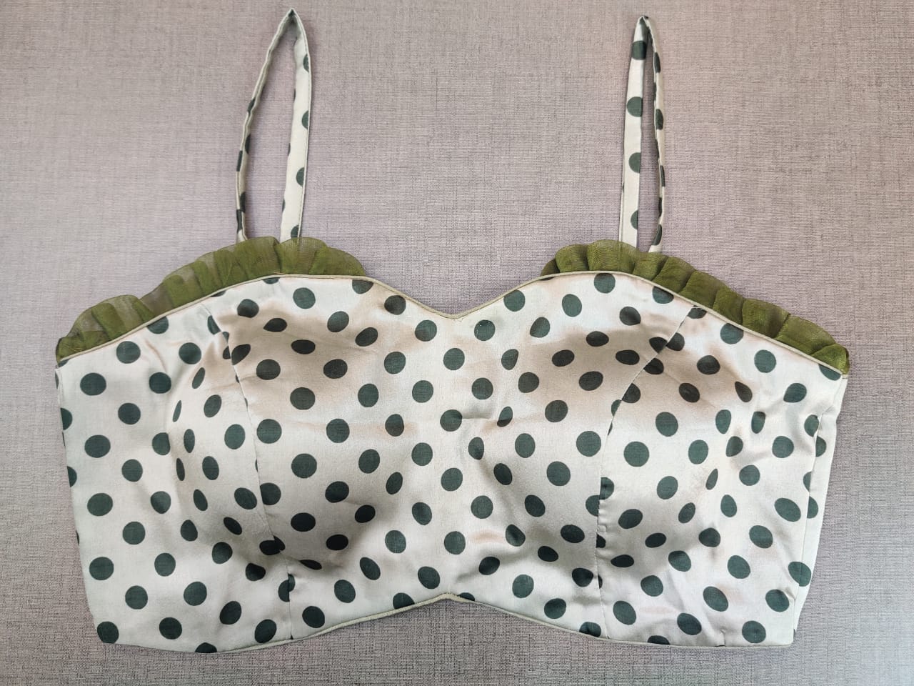 Stylish cream strappy saree blouse with olive green polka dots and frill edging. Buy designer blouse in USA from Pure Elegance.