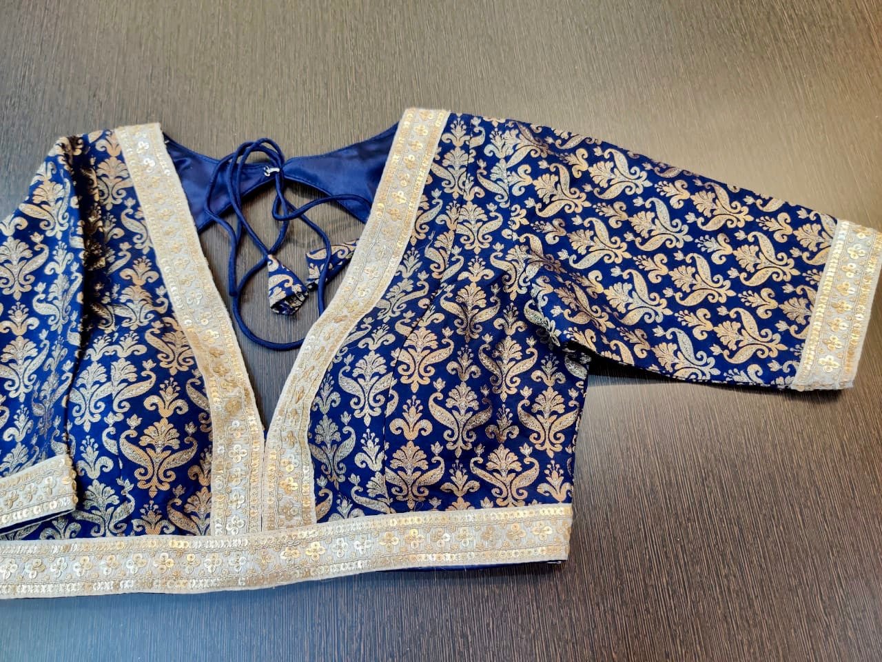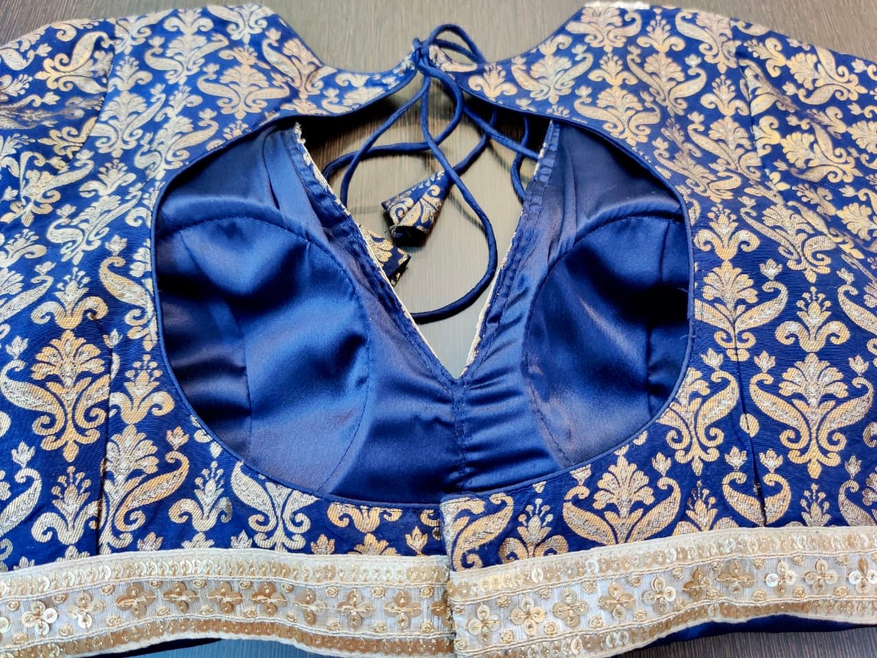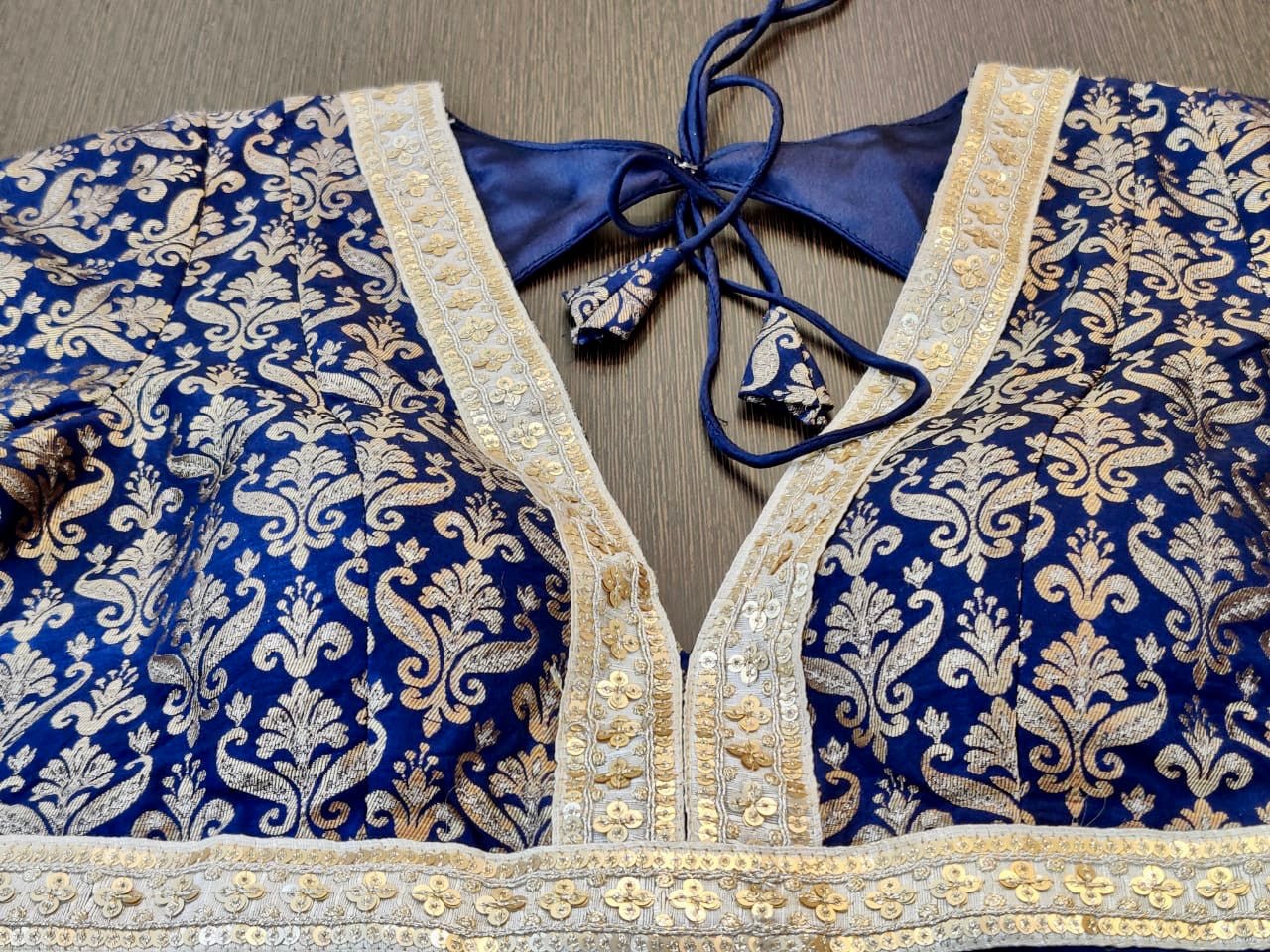 Beautiful dark blue designer sari blouse with zari work and embroidered lace. Buy online from Pure Elegance