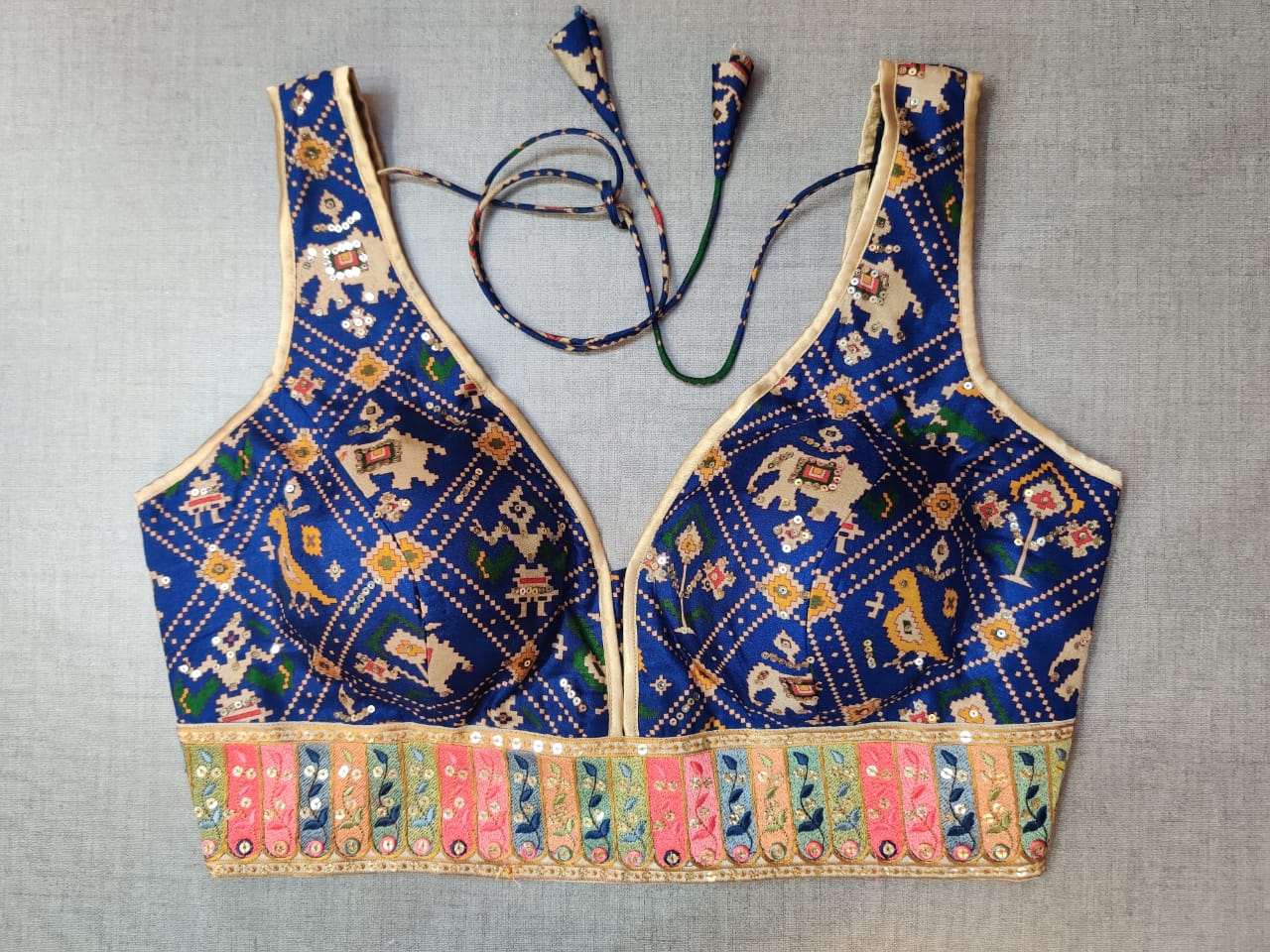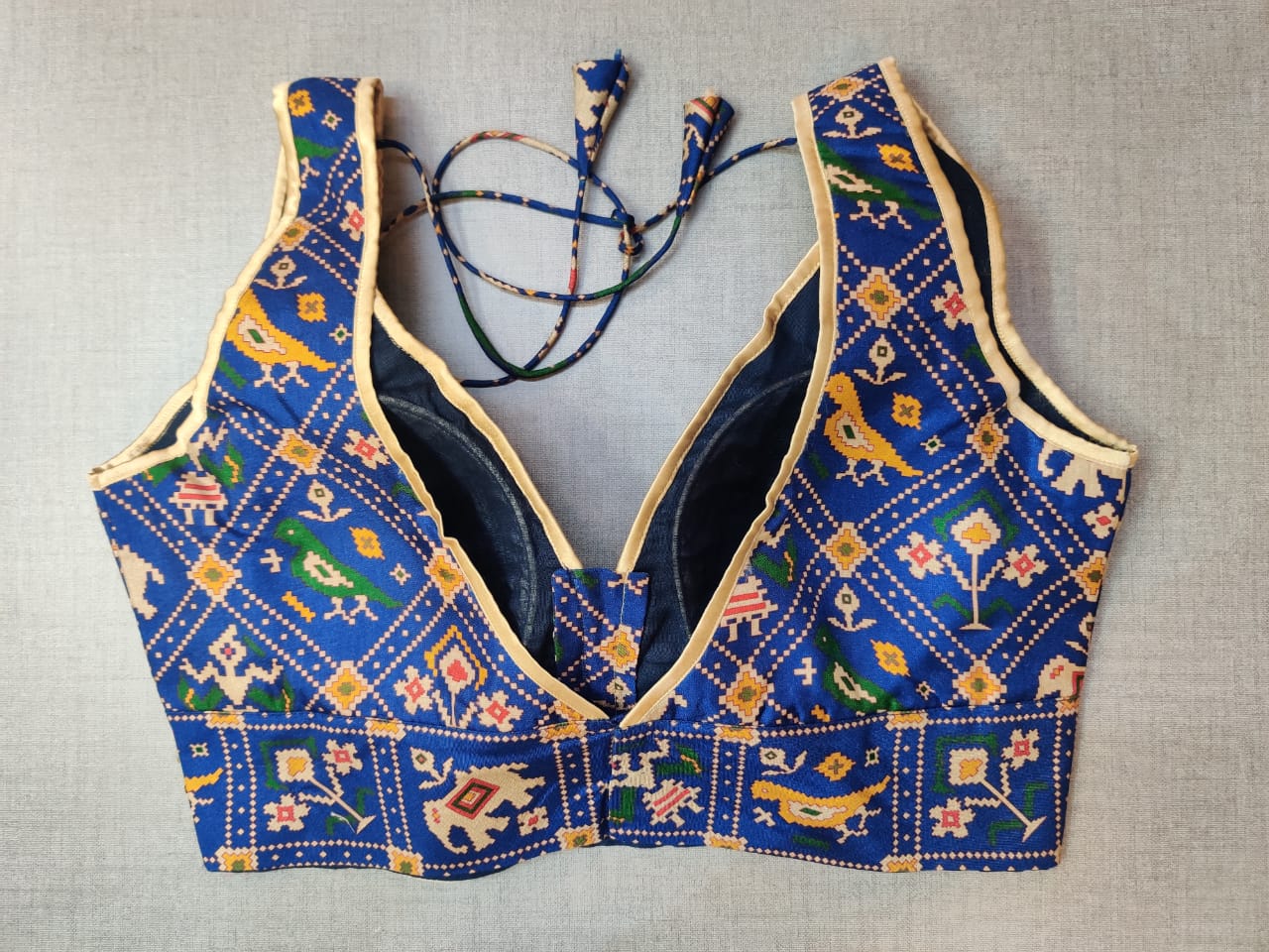 Beautiful dark Blue digital ikkat Patola print sleeveless sari blouse with embroidered border. Buy designer blouse in USA from Pure Elegance.