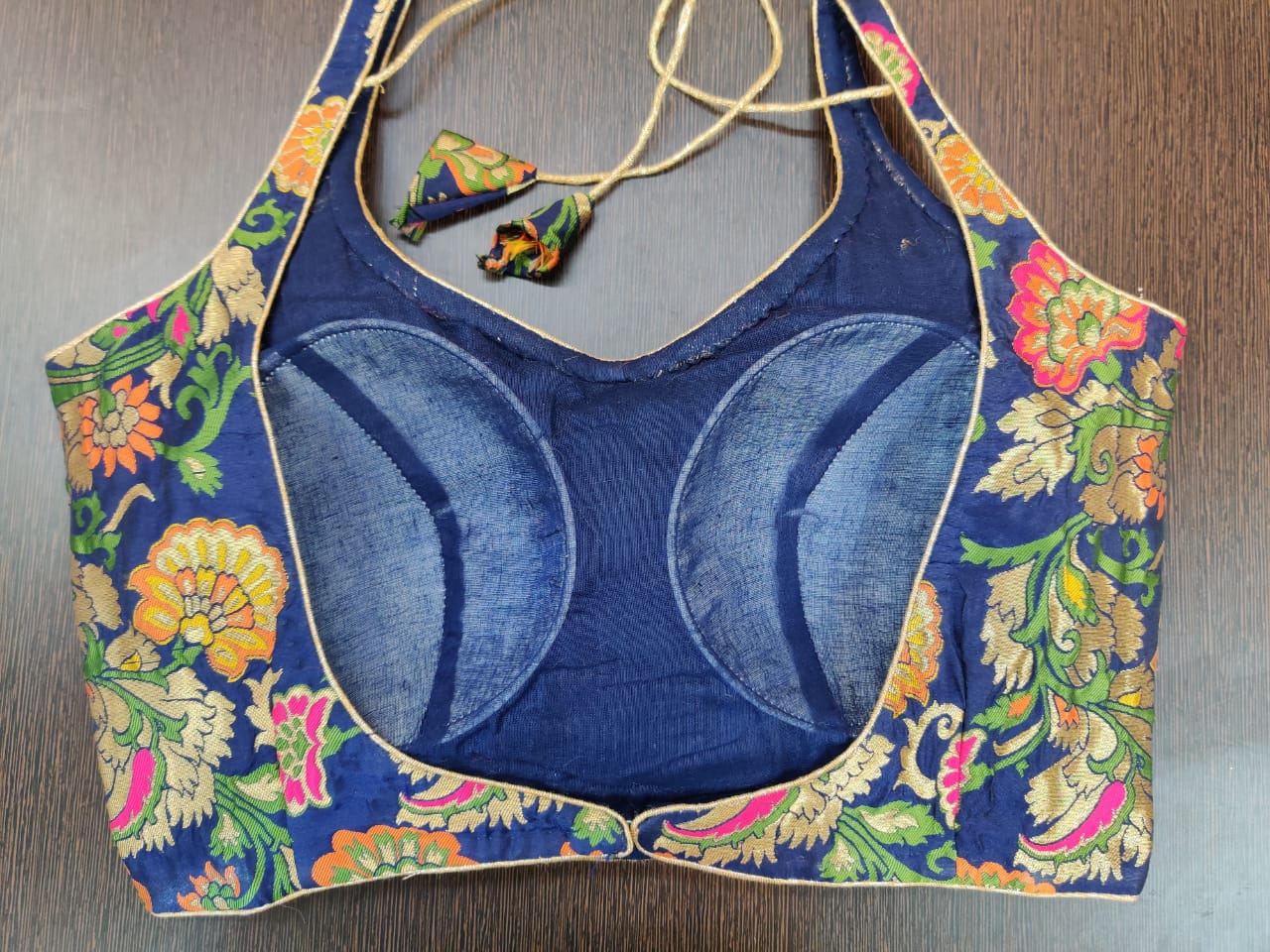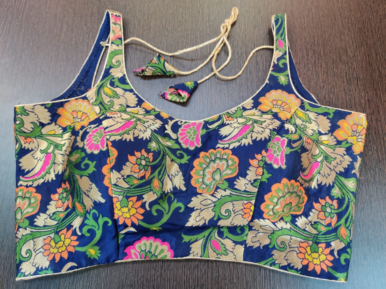 Stunning dark blue Banarasi sleeveless designer sari blouse. Buy designer blouse in USA from Pure Elegance.