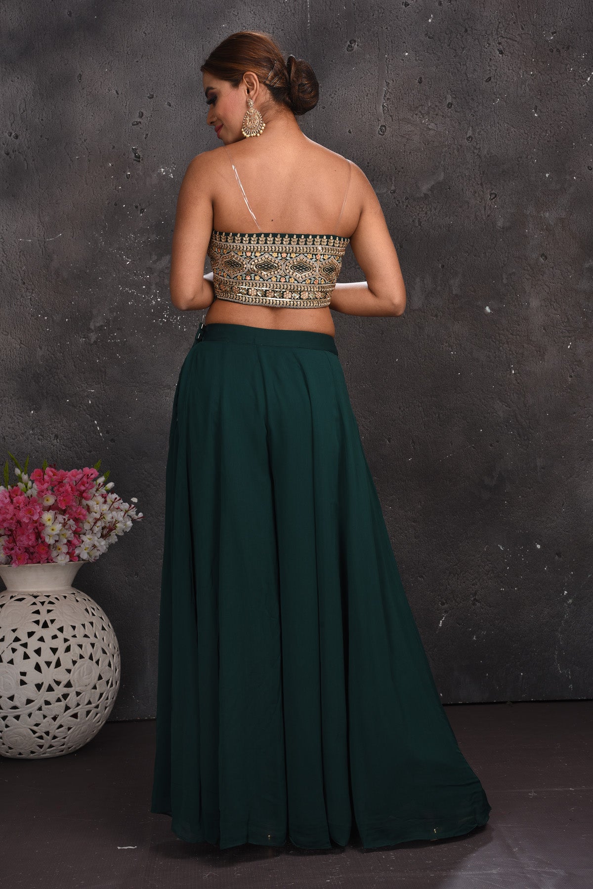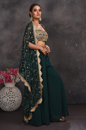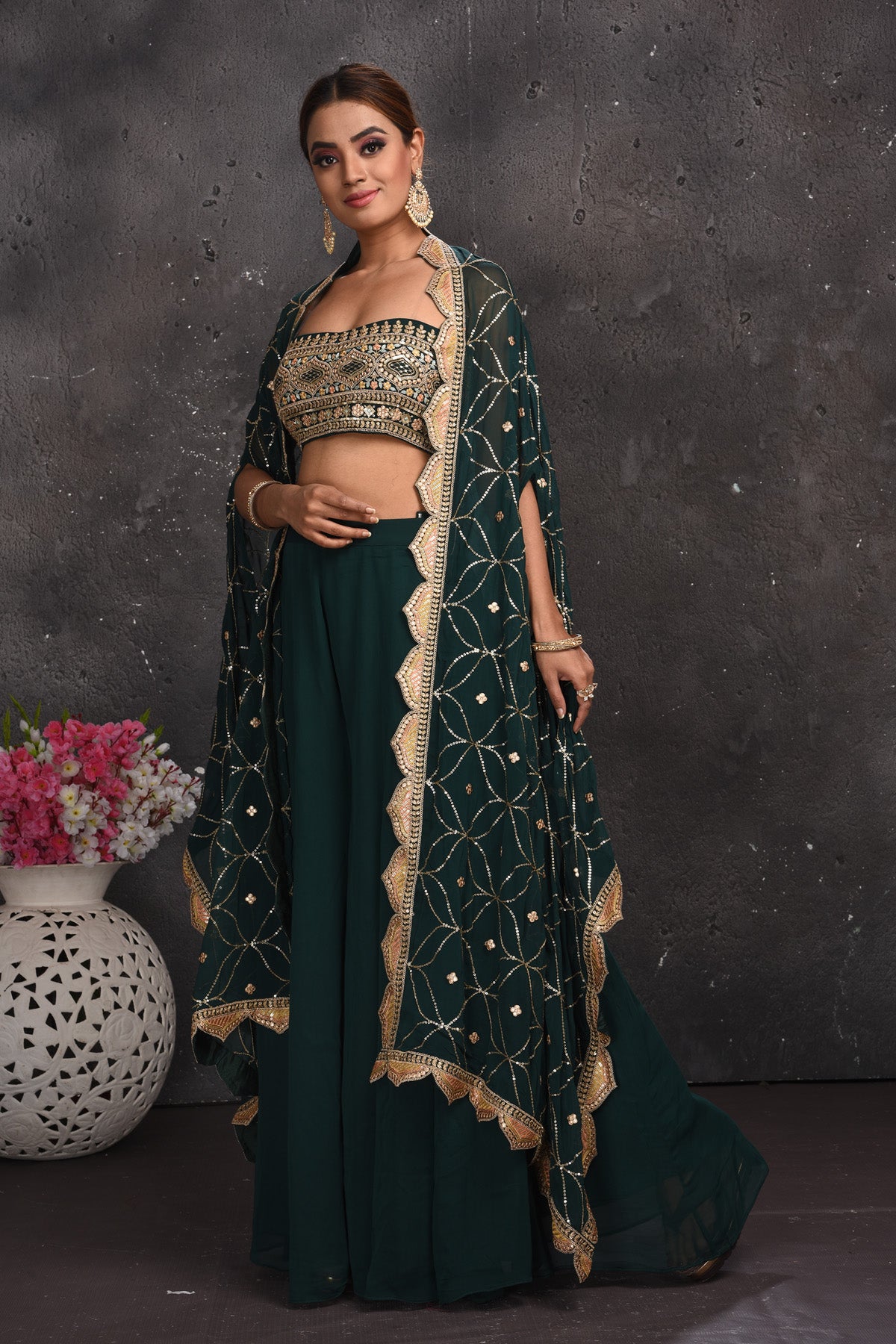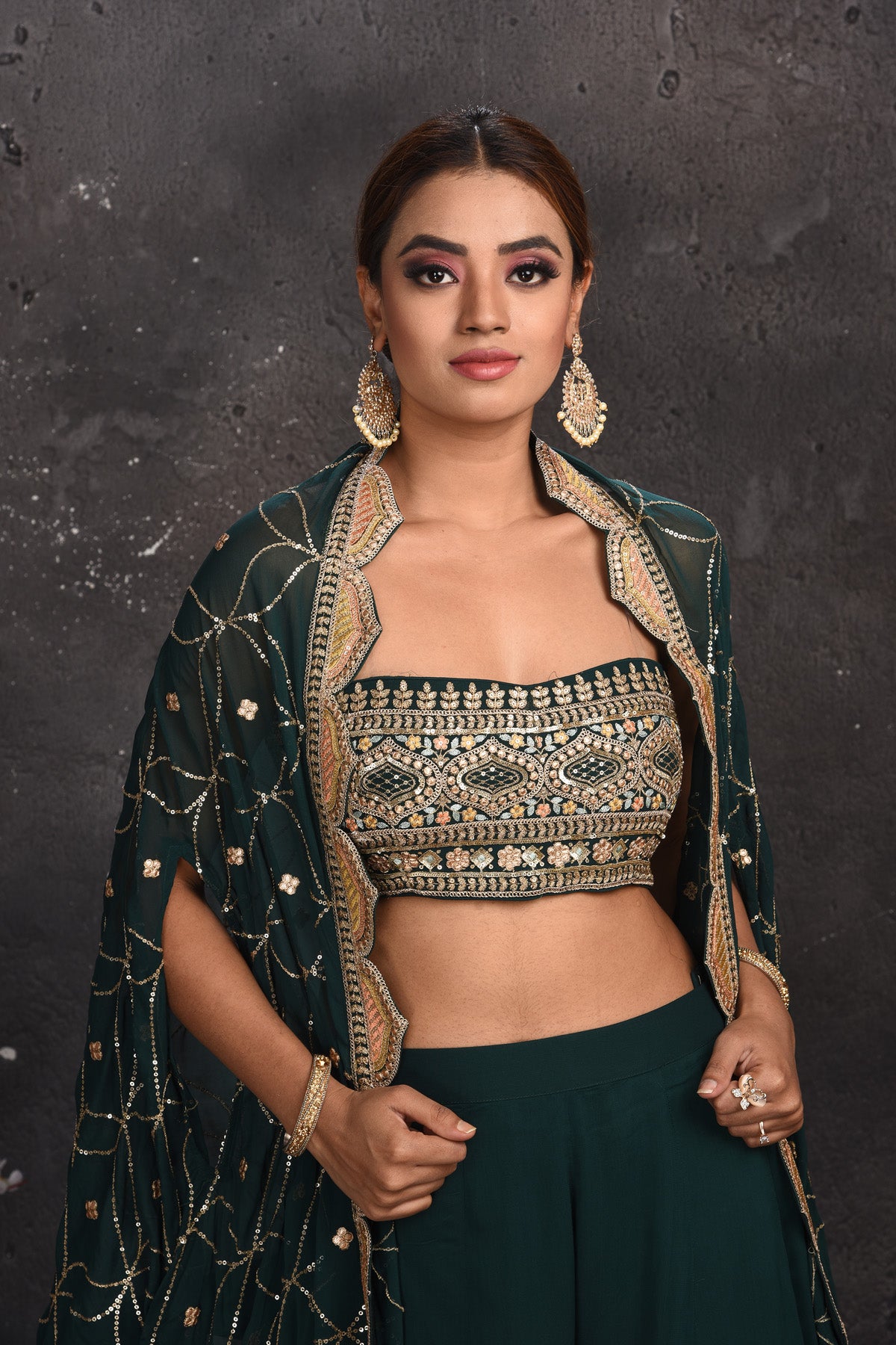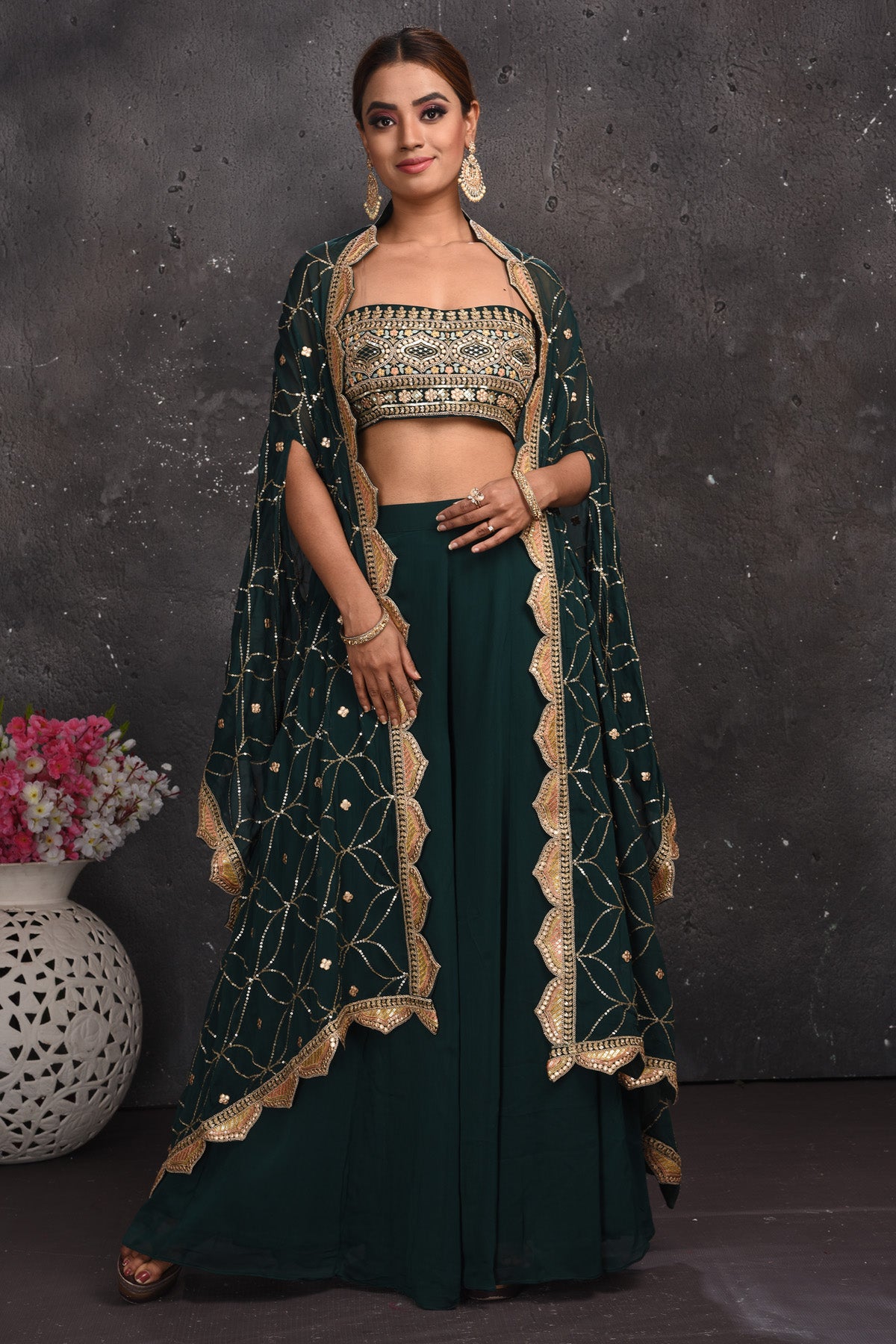 Go for a feminine and contemporary style on wedding and festive occasions in this beautiful dark green embroidered palazzo crop top with longline shrug. Shop designer dresses in USA from Pure Elegance.