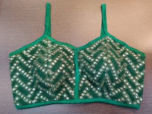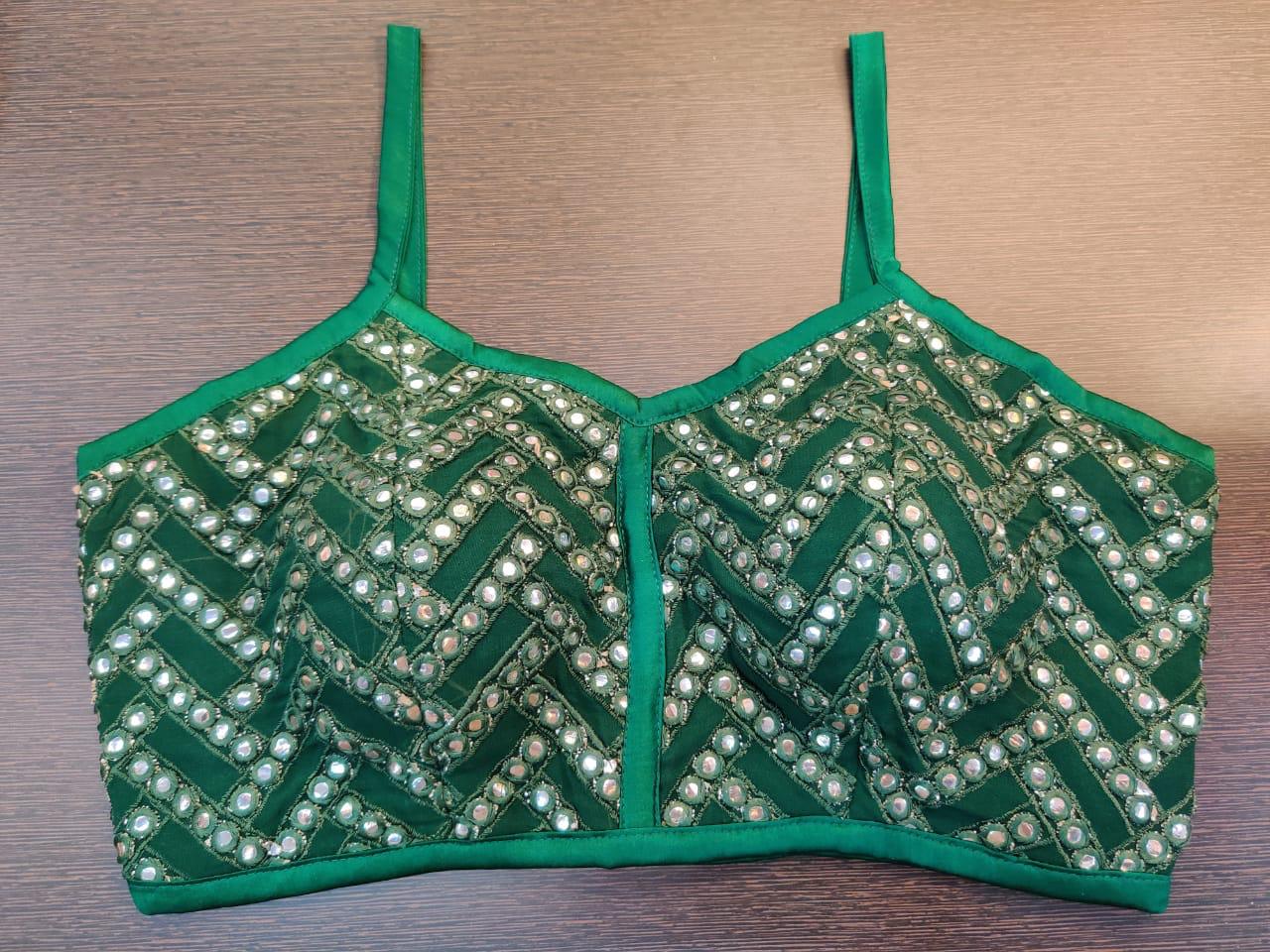 Glamorous dark green mirror work strappy saree blouse. Shop designer saree blouse online in USA from Pure Elegance.