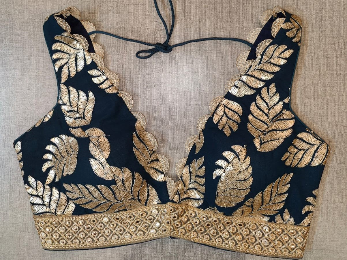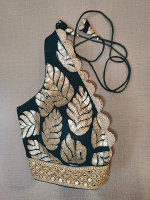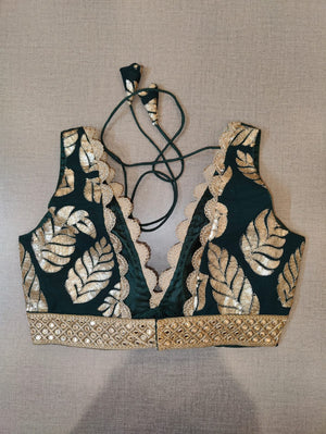 Stunning dark green sleeveless saree blouse with sequin leaf motifs. The blouse is enhanced with scalloping lace and mirror work border. Buy designer blouse in USA from Pure Elegance.