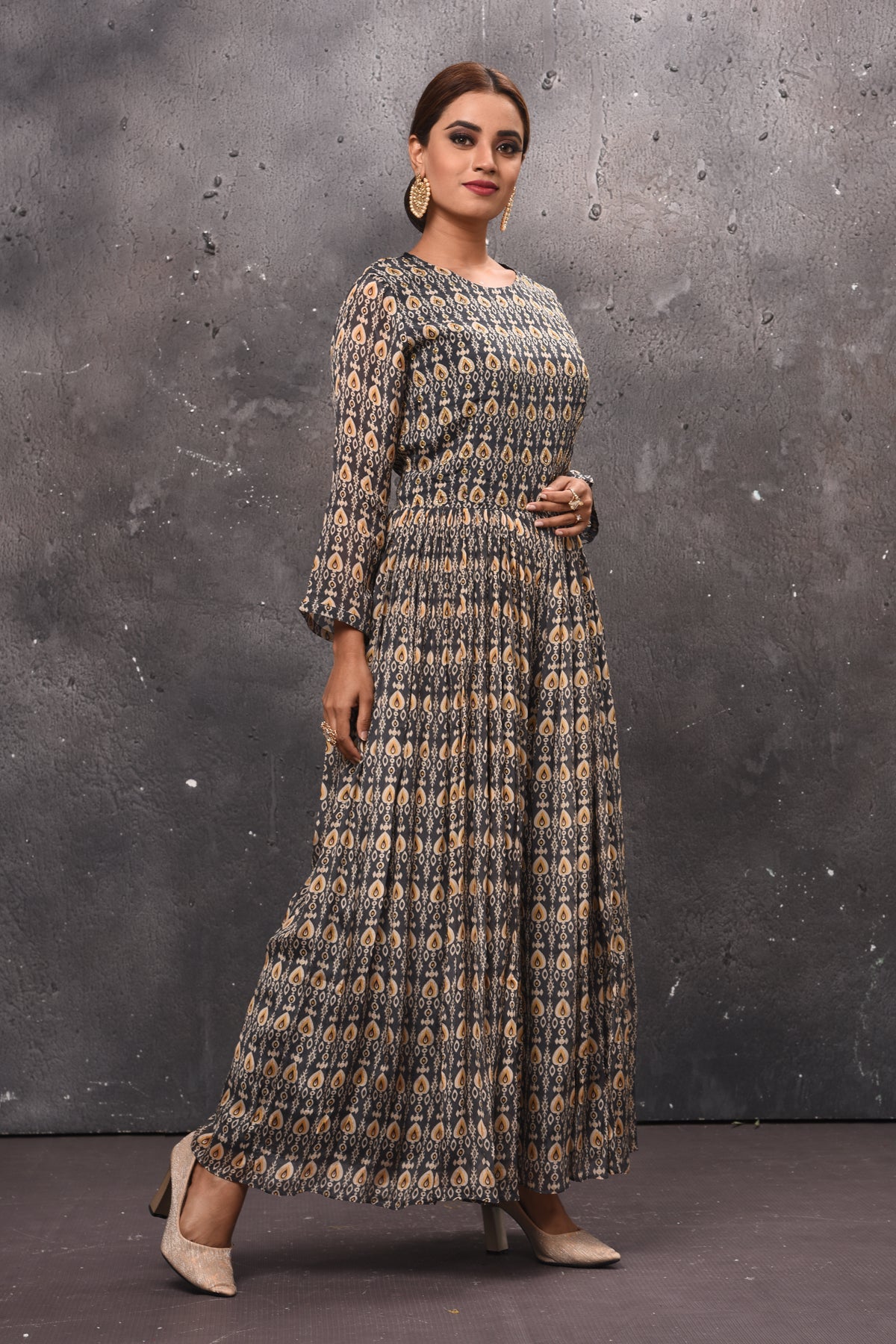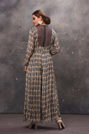 Be the center of attraction in this gorgeous dark grey printed jumpsuit with sheer back