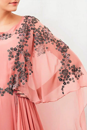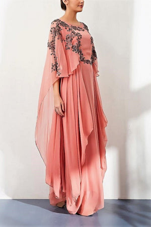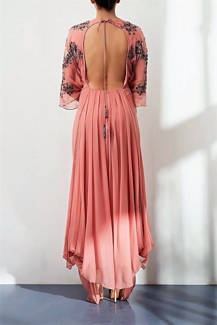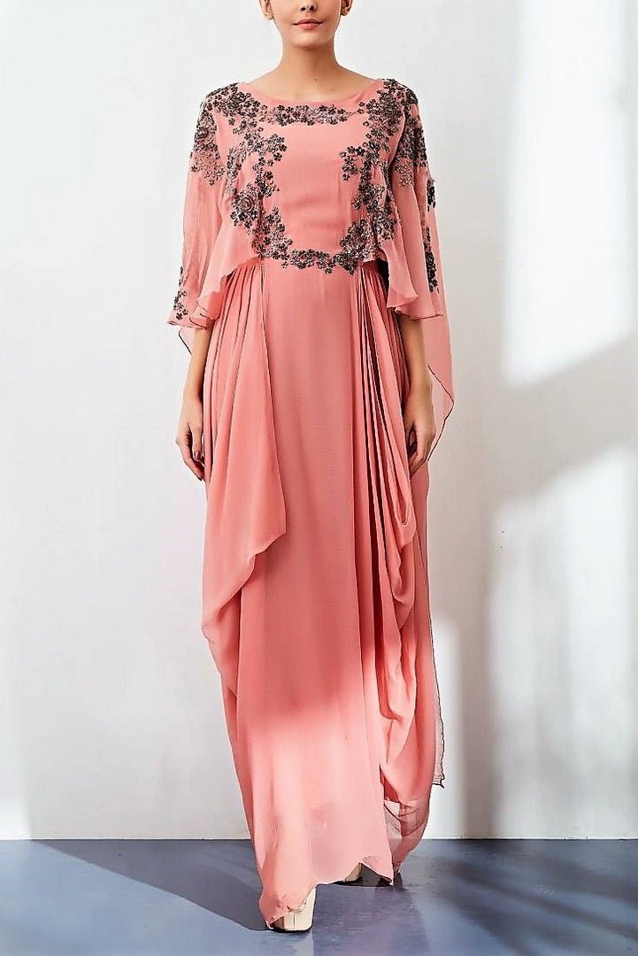Keep it classy with this alluring pink embroidered draped long chiffon dress by Kavita Bhartia on special occasions. The ensemble is crafted with black pearl embroidery. Shop online at Pure Elegance or visit our store in USA.