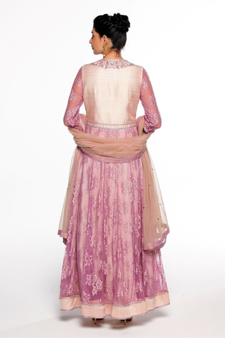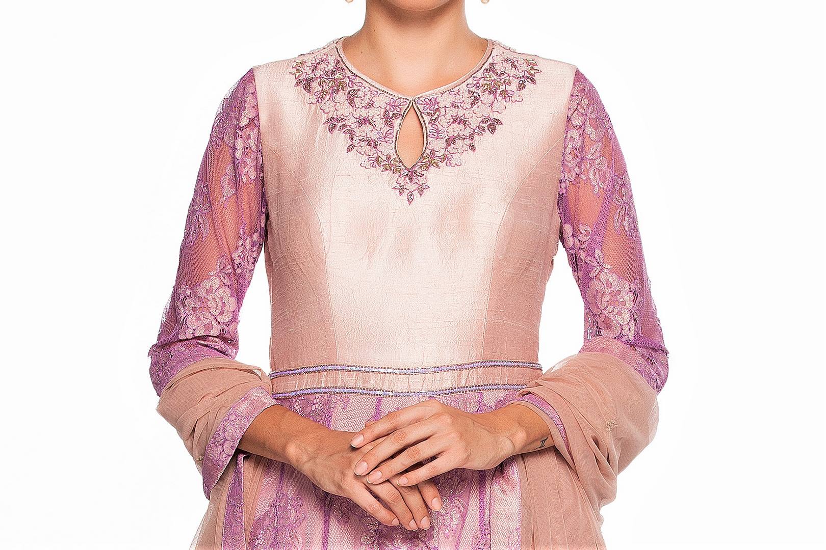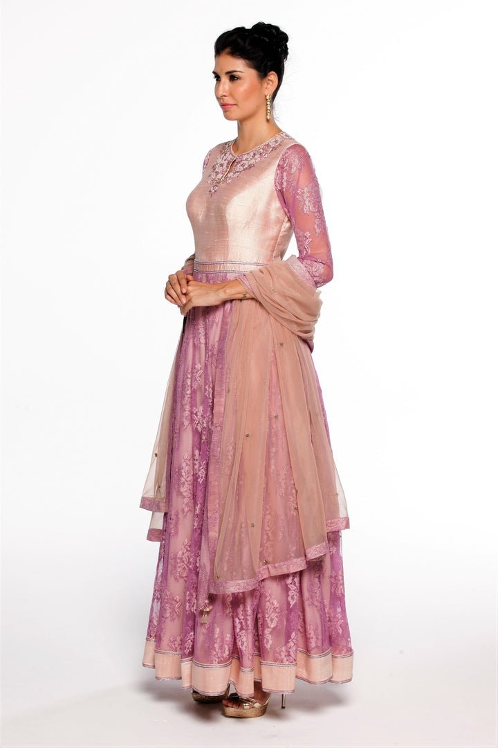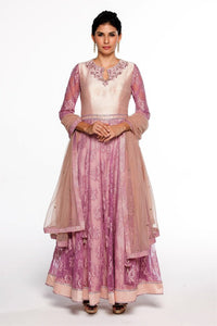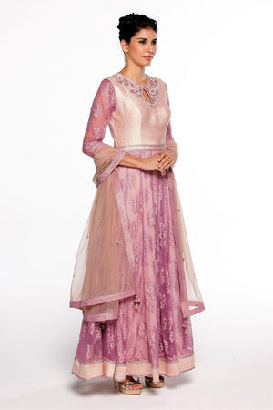 Elegant purple metallic lace Anarkali suit with embroidery for parties and special occasions! Shop online at Pure Elegance or visit our store in USA!