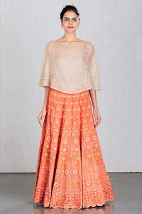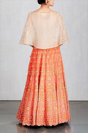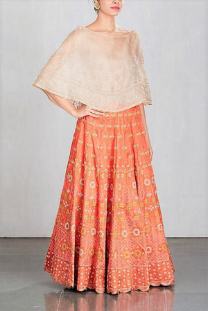 Go for an Indowestern style with this dull gold embroidered cape and peach color skirt by Kavita Bhartia on wedding occasions. The ensemble is crafted in organza and dupion. Shop online at Pure Elegance or visit our store in USA.