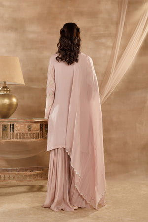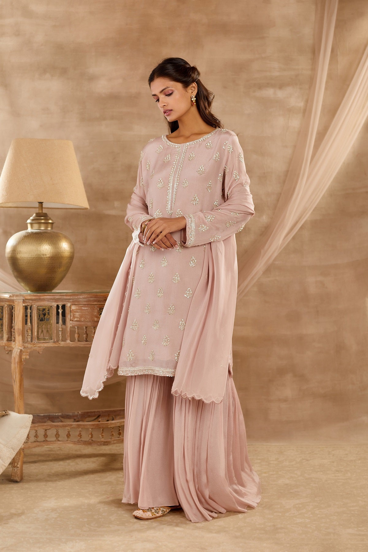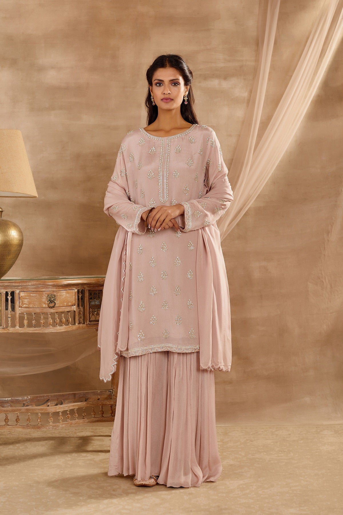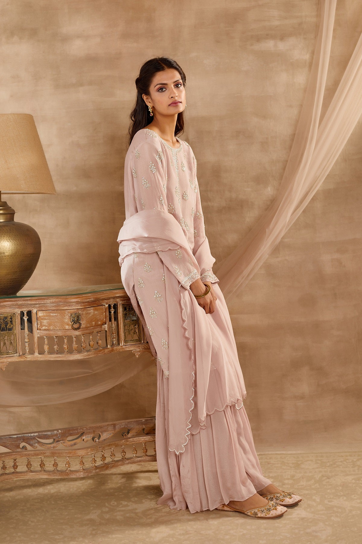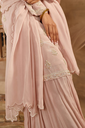 Beautiful dusty pink embroidered georgette sharara suit. It is perfect for parties and special occasions. Shop online from Pure Elegance.