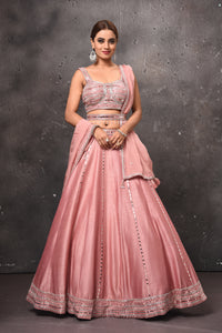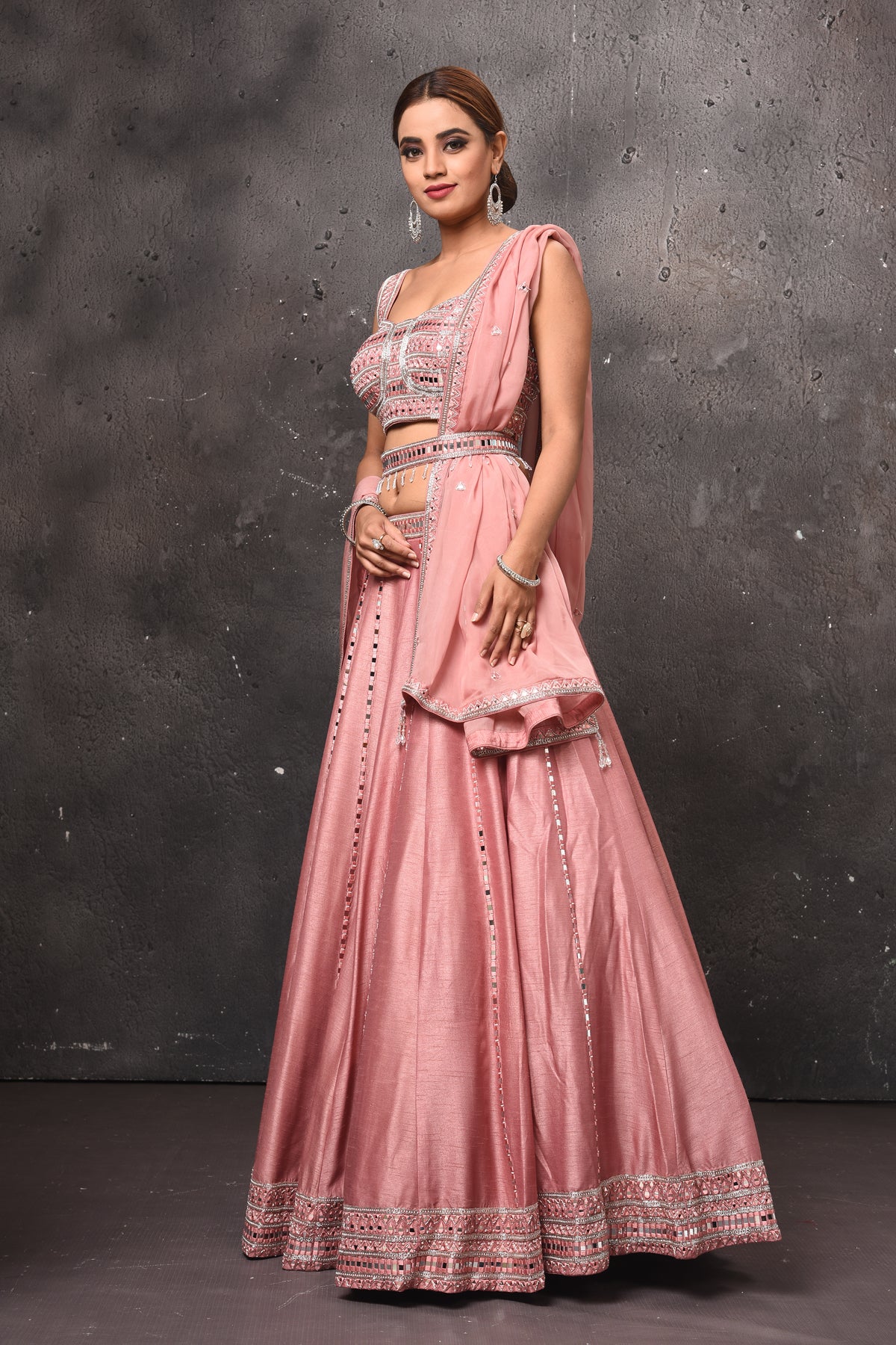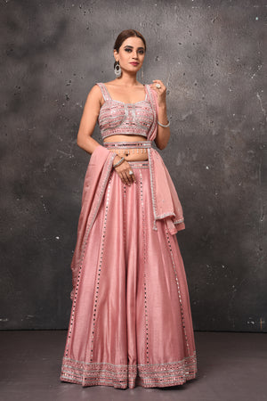 Be the center of attraction in this alluring dusty pink mirror work belted lehenga with dupatta. The lehenga is perfect ensemble for wedding occasions and parties.