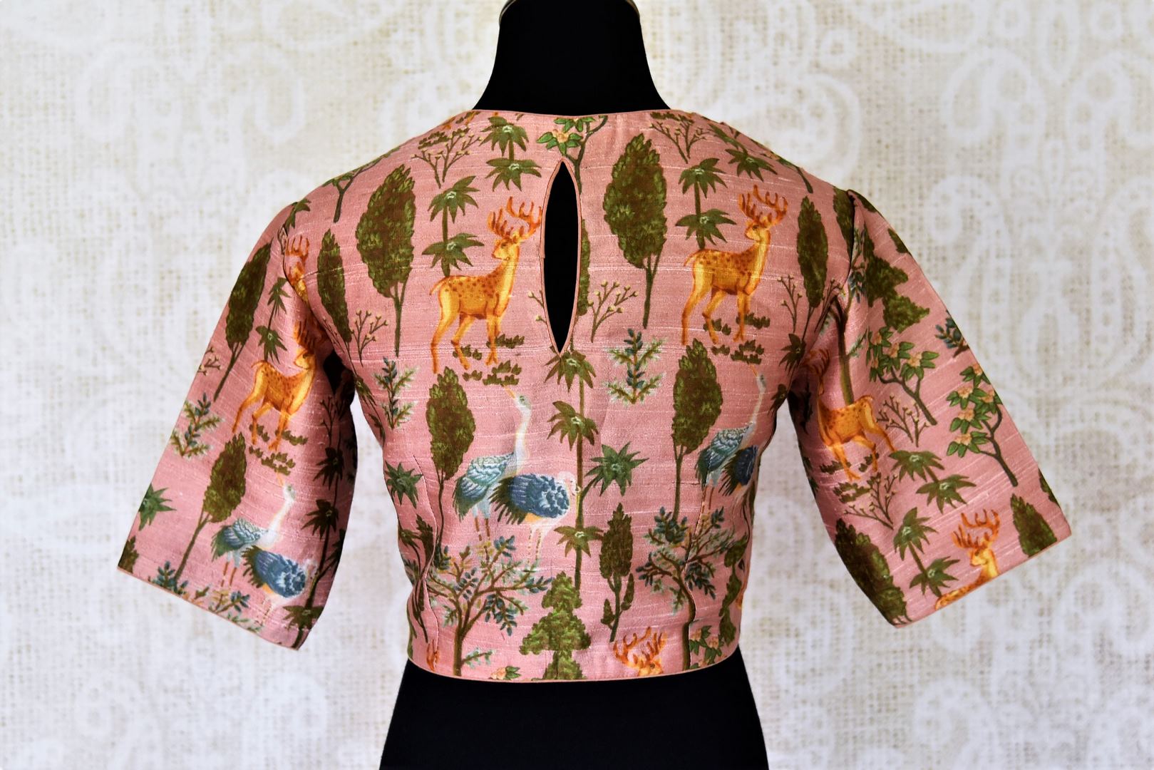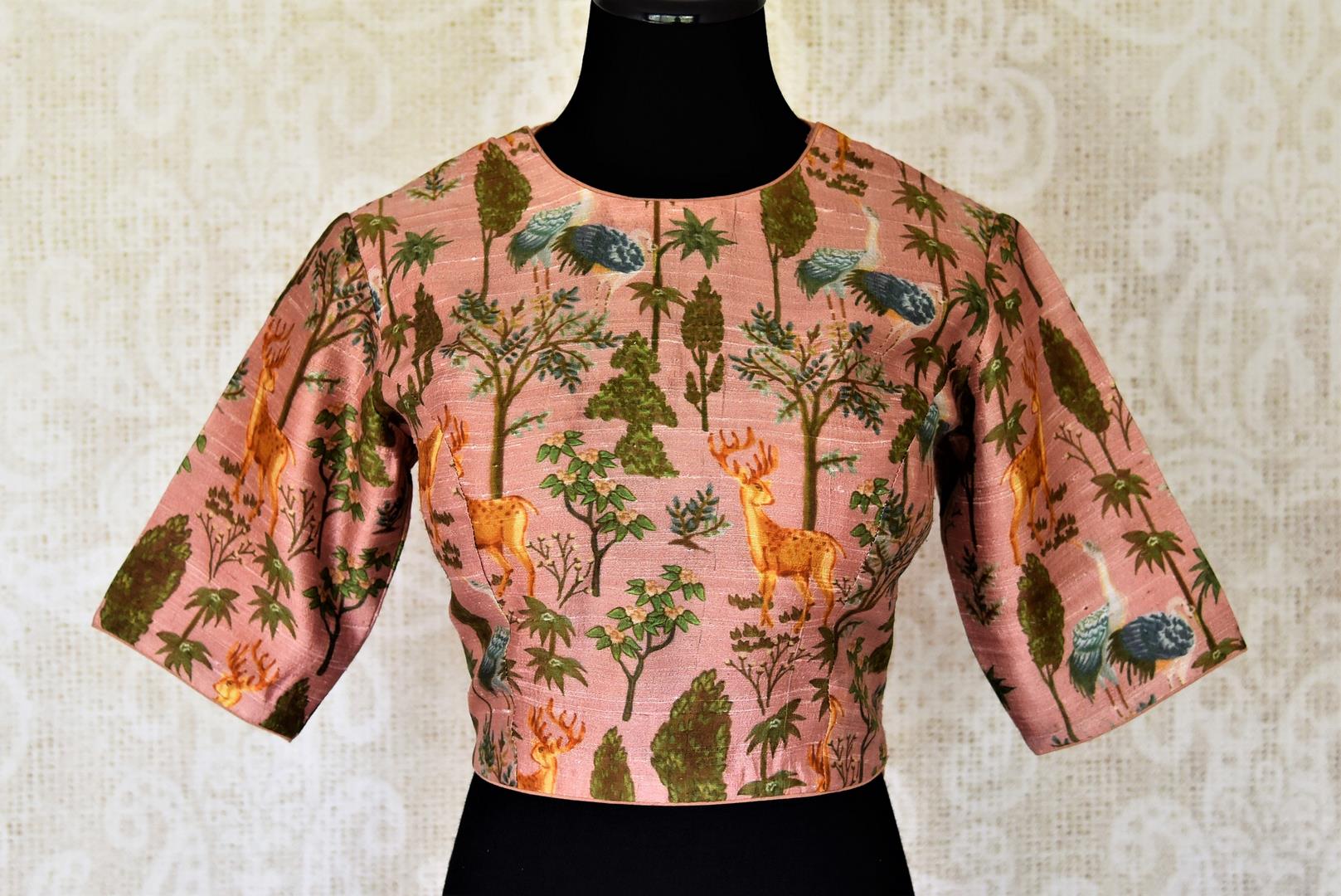 Gorgeous dusty pink printed silk designer saree blouse. Shop designer saree blouse in USA from Pure Elegance.