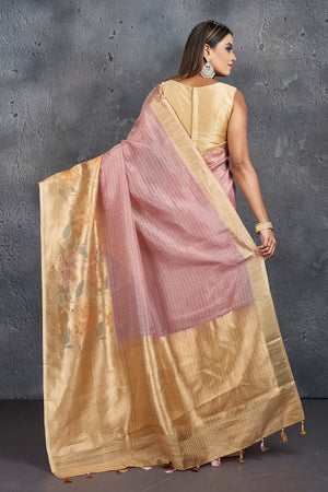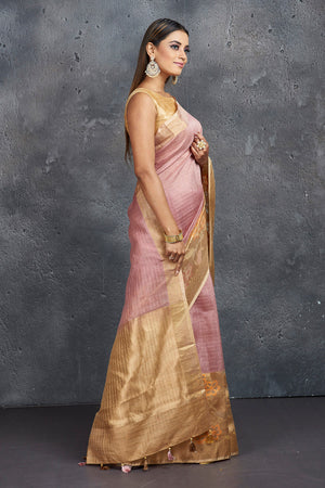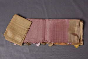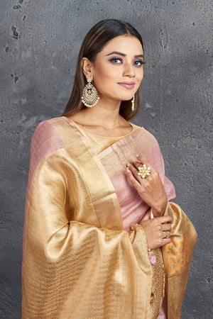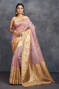 Look elegant at weddings and festive occasions in this stunning dusty pink tussar Banarasi saree. The saree is adorned with golden zari border and zari pallu. It comes with a matching blouse piece. Shop Banarasi sarees in USA from Pure Elegance.