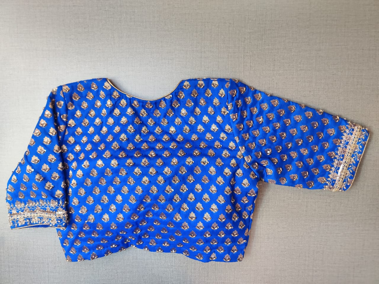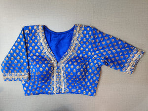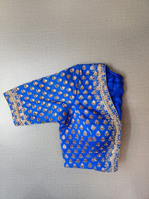 Beautiful electric blue embroidered Banarasi sari blouse. Buy designer blouse in USA from Pure Elegance.