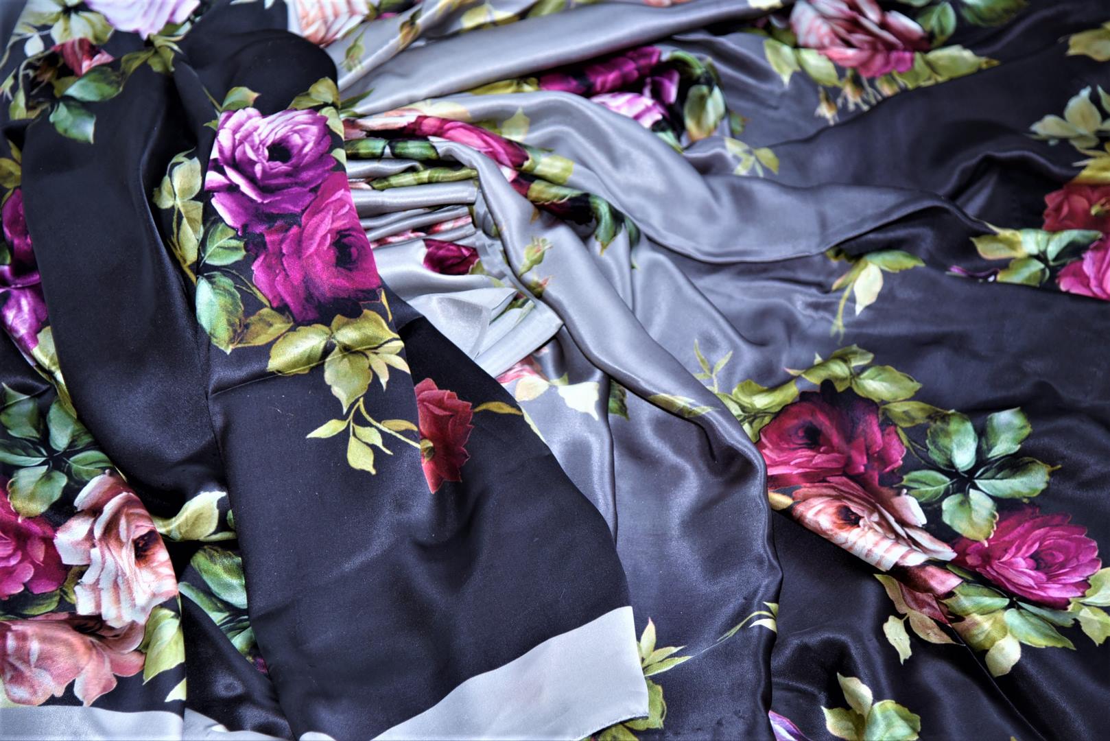 Elegant ombre grey floral satin crepe saree. It comes with a black blouse piece. Shop online from Pure Elegance.