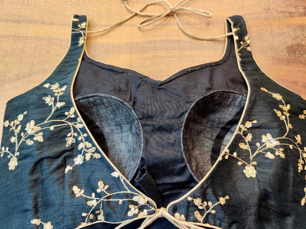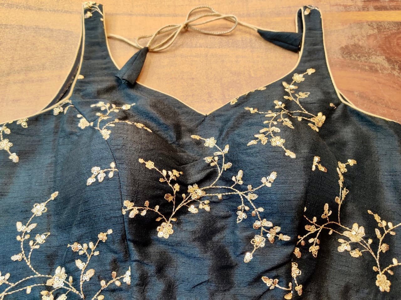 Gorgeous black embroidered sleeveless sari blouse. Buy online from Pure Elegance