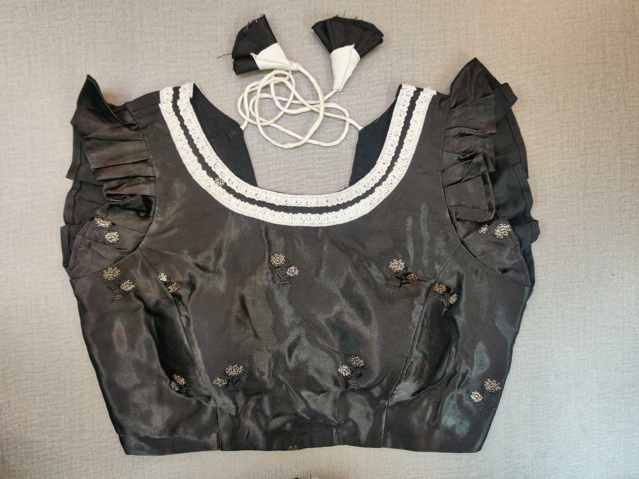 Beautiful black saree blouse with frill sleeves. Buy designer blouse in USA from Pure Elegance.