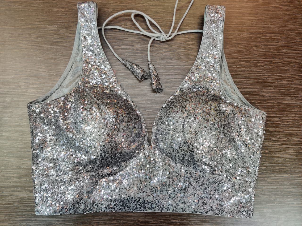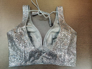 Stunning grey sequin work sleeveless sari blouse. Buy designer blouse in USA from Pure Elegance.