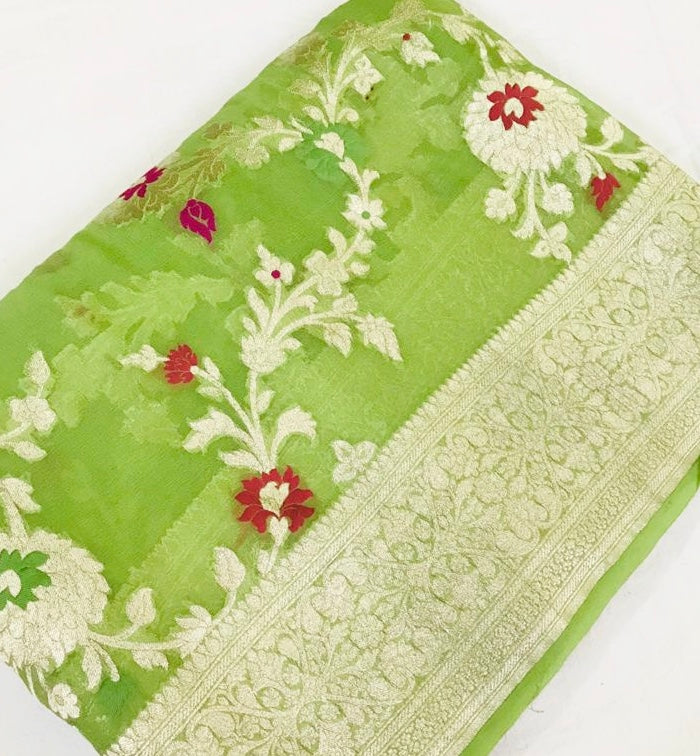 Attractive lime green silk Banarasi sari is a perfect choice for parties! It comes with a matching blouse piece.
