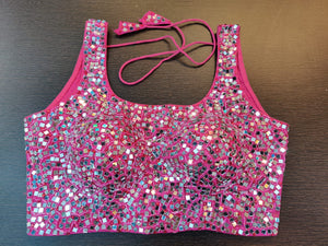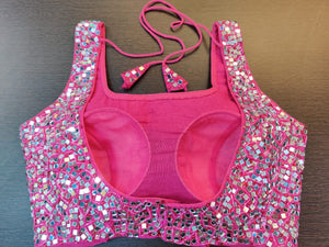 Beautiful pink designer saree blouse with mirror work. Buy online from Pure Elegance