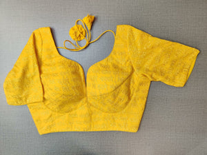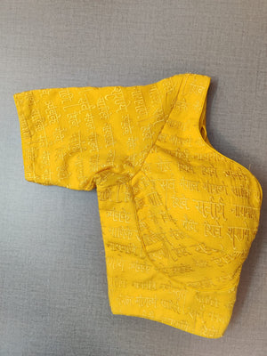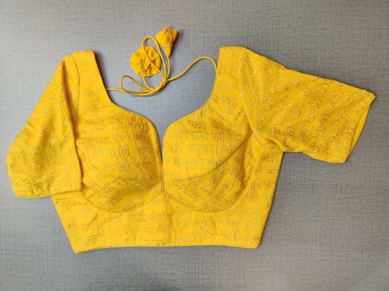 Gorgeous yellow saree blouse with mantra embroidery. Buy designer blouse in USA from Pure Elegance.