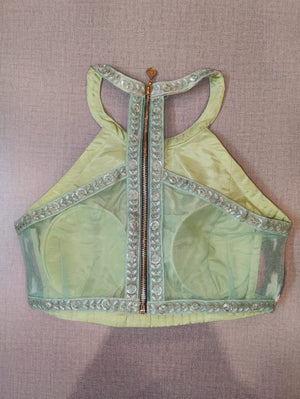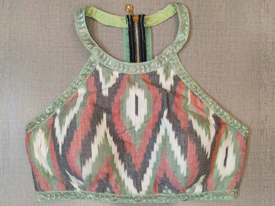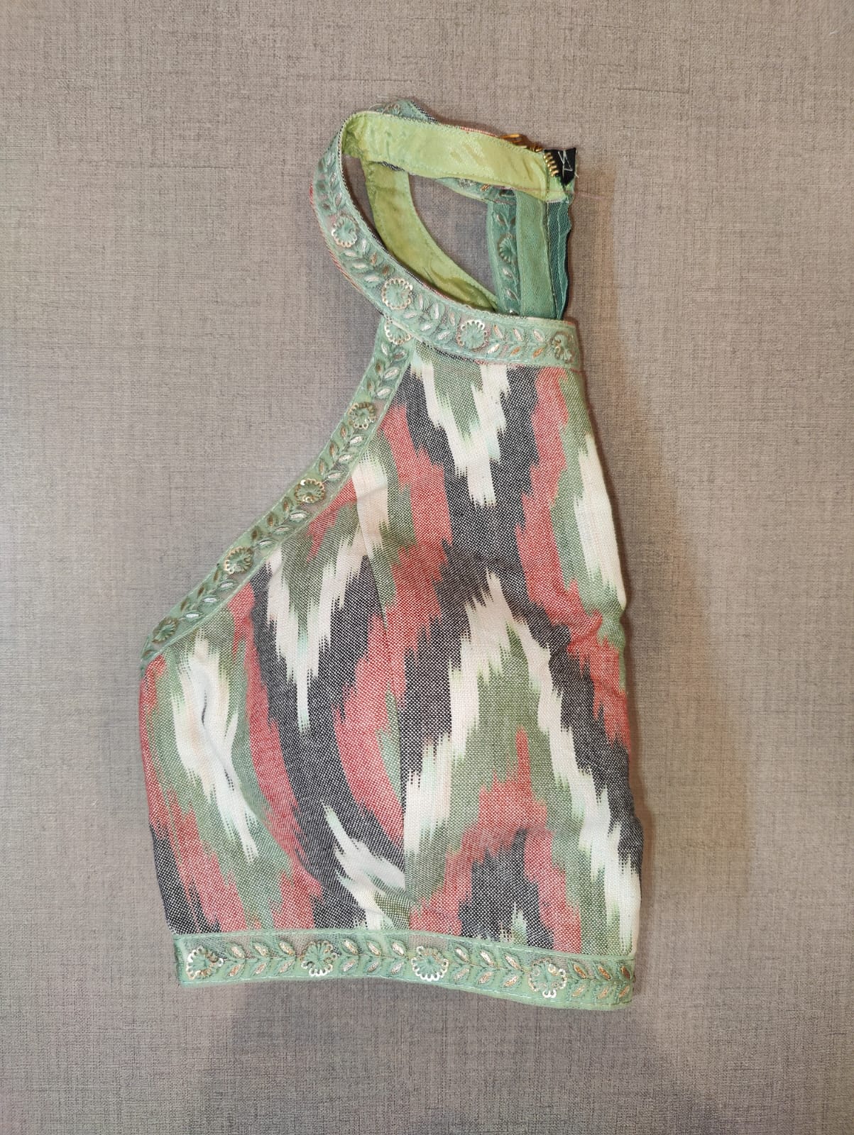 Stunning green and red ikkat faux halter neck saree blouse. Buy designer blouse in USA from Pure Elegance.